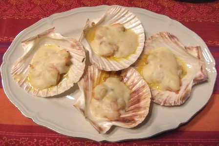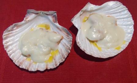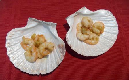 Las gambas al ajillo son fáciles de hacer y están buenísimas, se suelen tomar en las mismas cazuelitas en las que se hacen, con su ajito, su guindilla…Pero en esta ocasión les he incorporado dos novedades, por una parte las he cubierto con bechamel y horneados posteriormente. Y por otra parte las he presentado en conchas de vieiras que compré en mi último viaje Galicia. Quedan muy bien a la vista y no digamos cómo están…riquísimas.