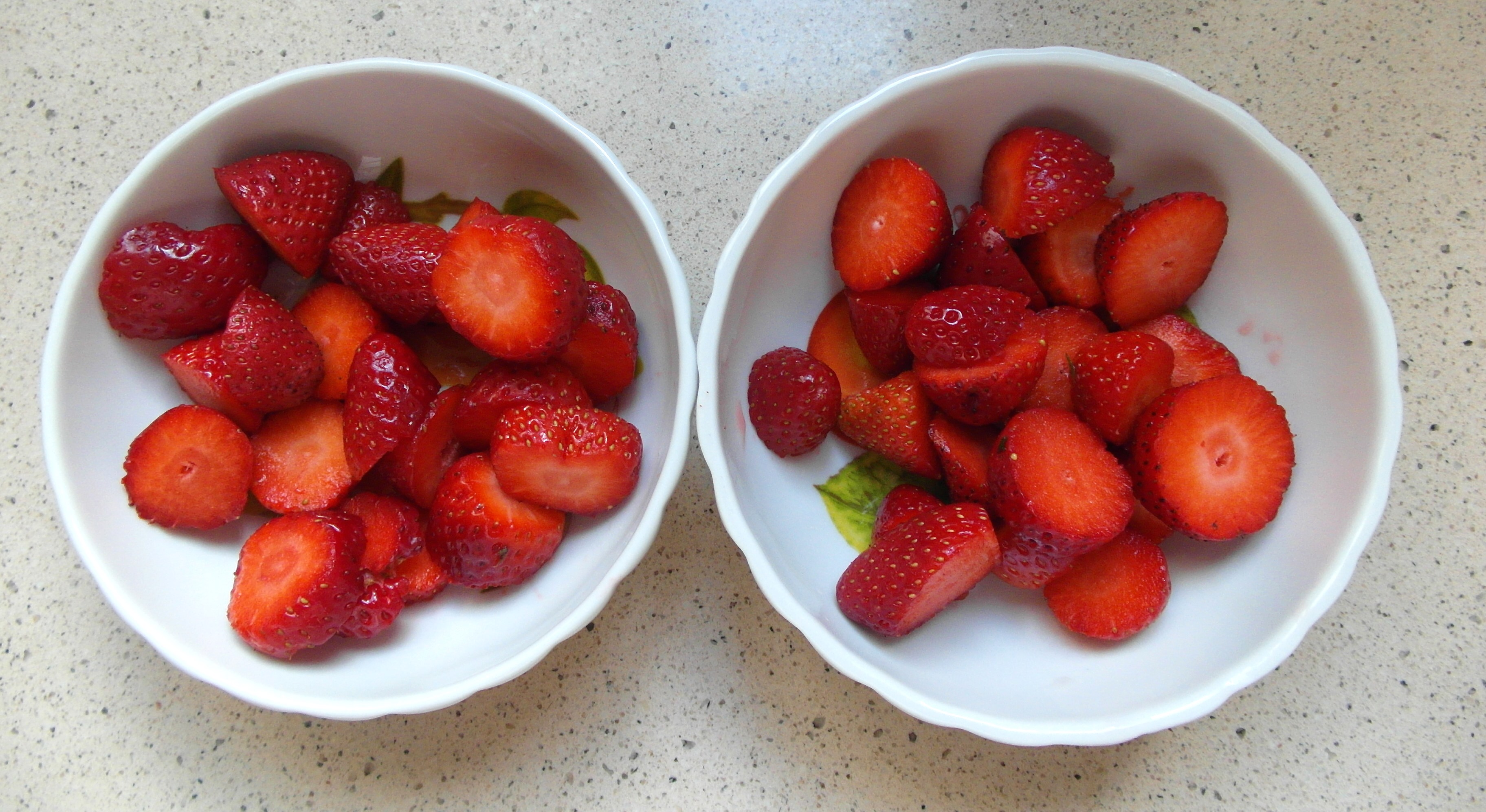 Con leche condensada: Lavamos y cortamos las fresas y las ponemos en un cuenco.