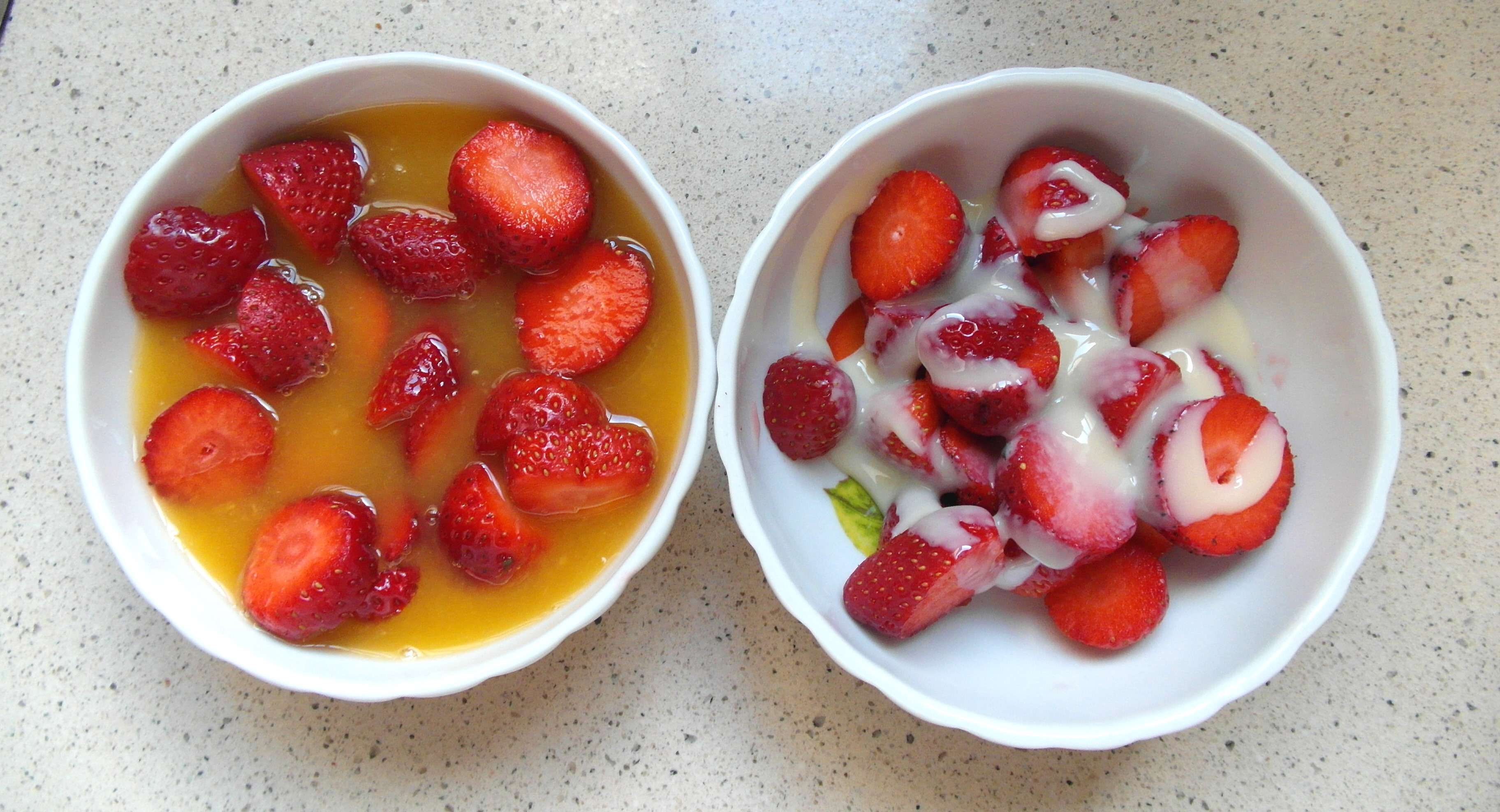 Aquí os pongo dos maneras de tomar esta fruta, una con leche condensada y otra con zumo de naranja. Con zumo de naranja: Exprimimos naranjas, dependiendo la cantidad de zumo de la de fresas.