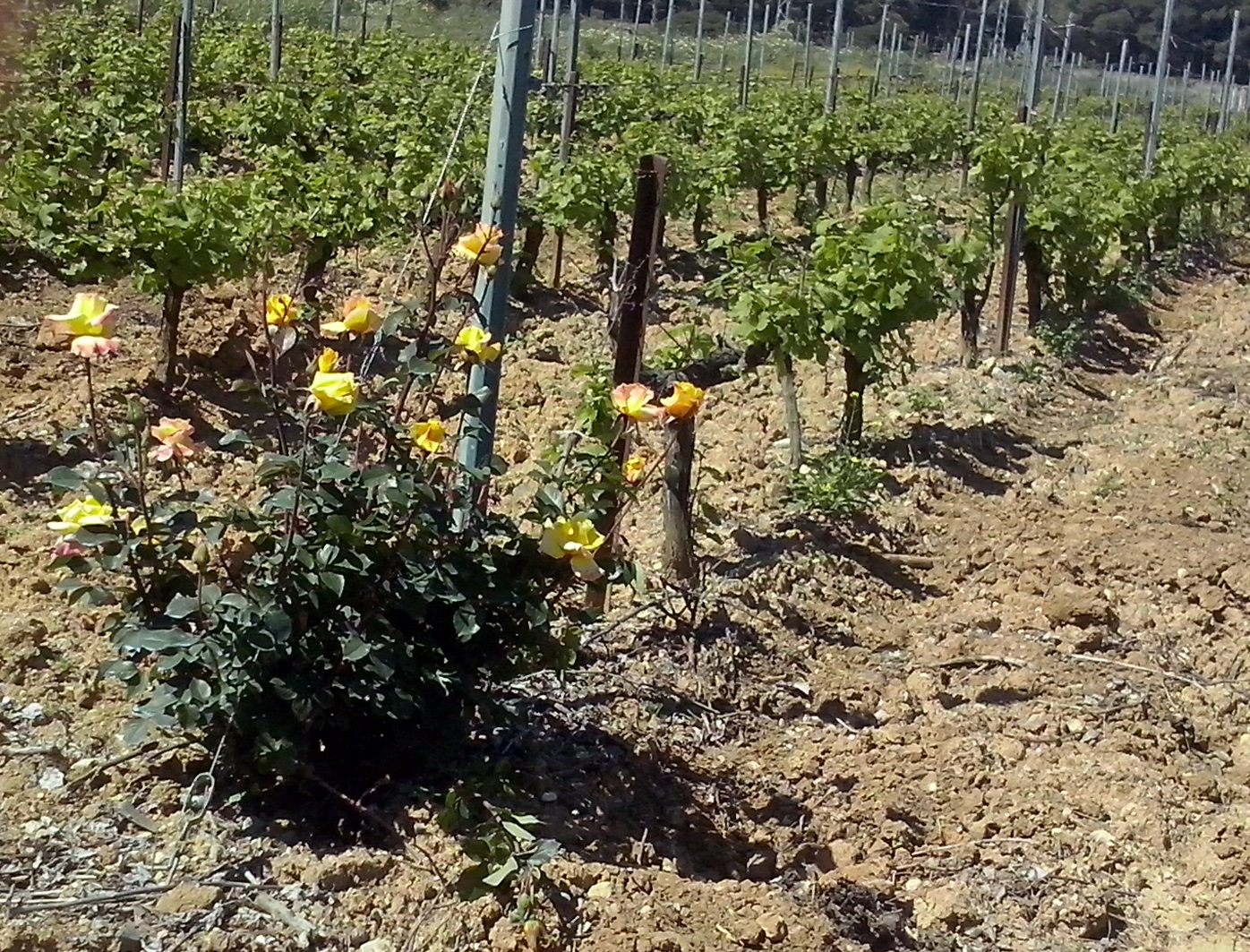 Vimos entre los viñedos estos rosales de los que Chano explicó su presencia. El motivo es preventivo.Las vides son a veces atacadas por hongos que provocan una enfermedad muy dañina. Este hongo también ataca a las rosas, y sus manchas son visibles en los rosales antes que en las vides. El rosal por lo tanto no es decorativo sino que sirve de alarma para detectar a tiempo la enfermedad y tratar los viñedos.