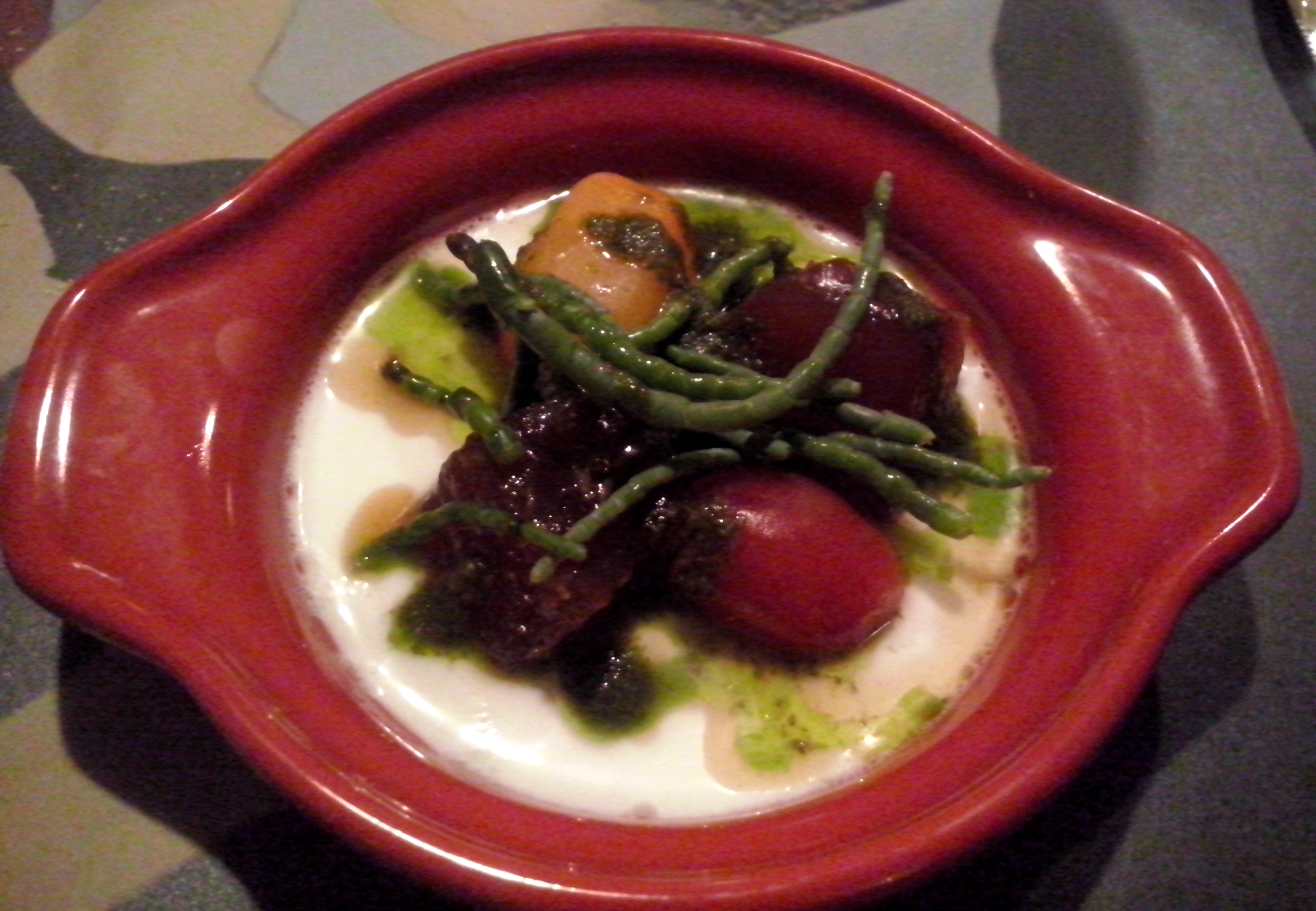 Vamos con el menú, que se componía de Bombón de cuajada láctica con lechuga de mar, sésamo y emulsión de soja y aceite de oliva. Acompañados de Queso de cabra semi curado frito, con confitura de calabaza con especias.