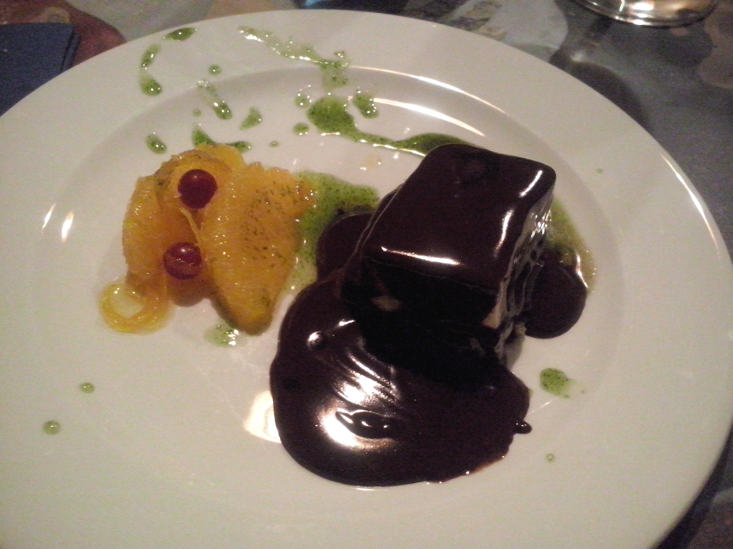 Y de postre Coca de naranja cion queso fresco, bañado de chocolate y acompañado con naranja fresca