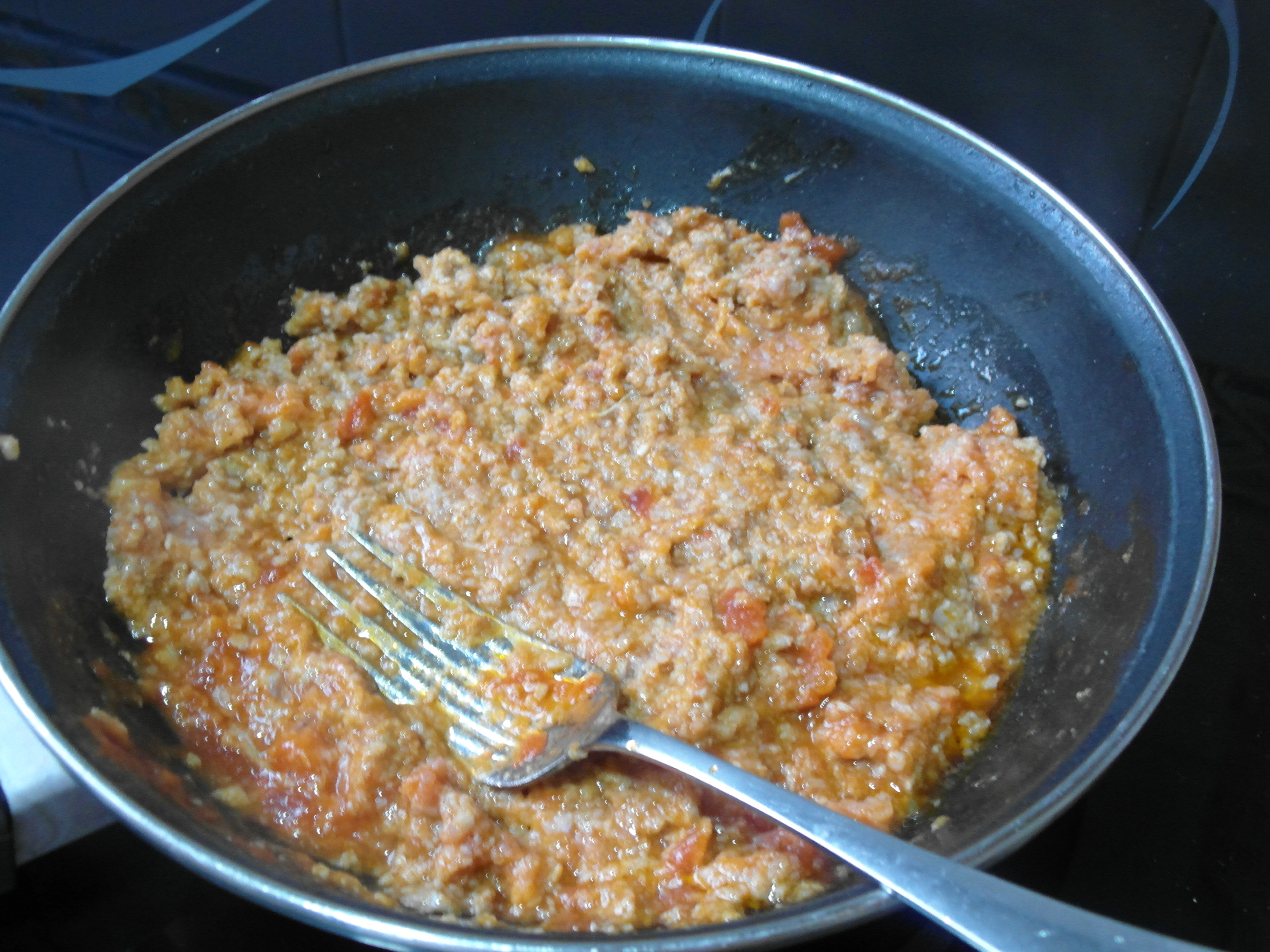 En una sartén refreímos la carne con un poquito de cebolla y ajo muy picadito, y añadimos el tomate frito, mezclando todo muy bien.