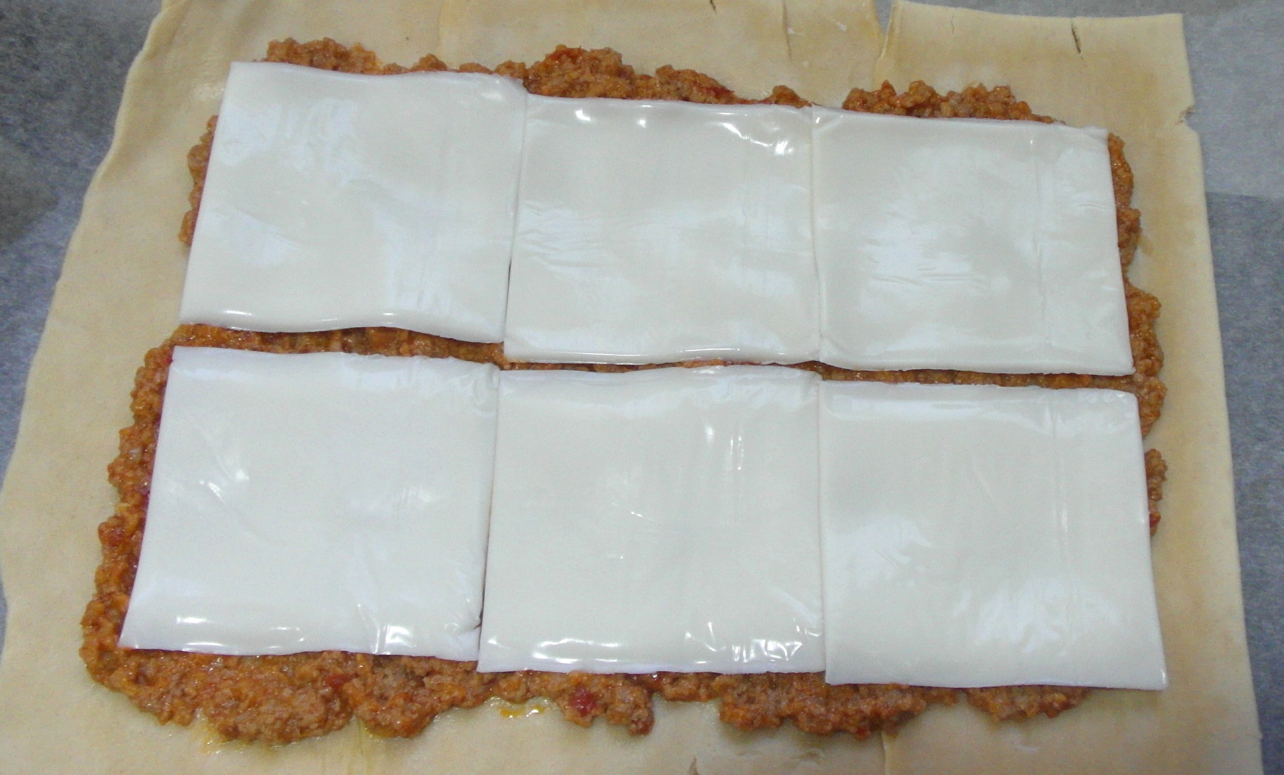 Esta mezcla la ponemos sobre la masa estirada y, sobre ella, las lonchas de queso.