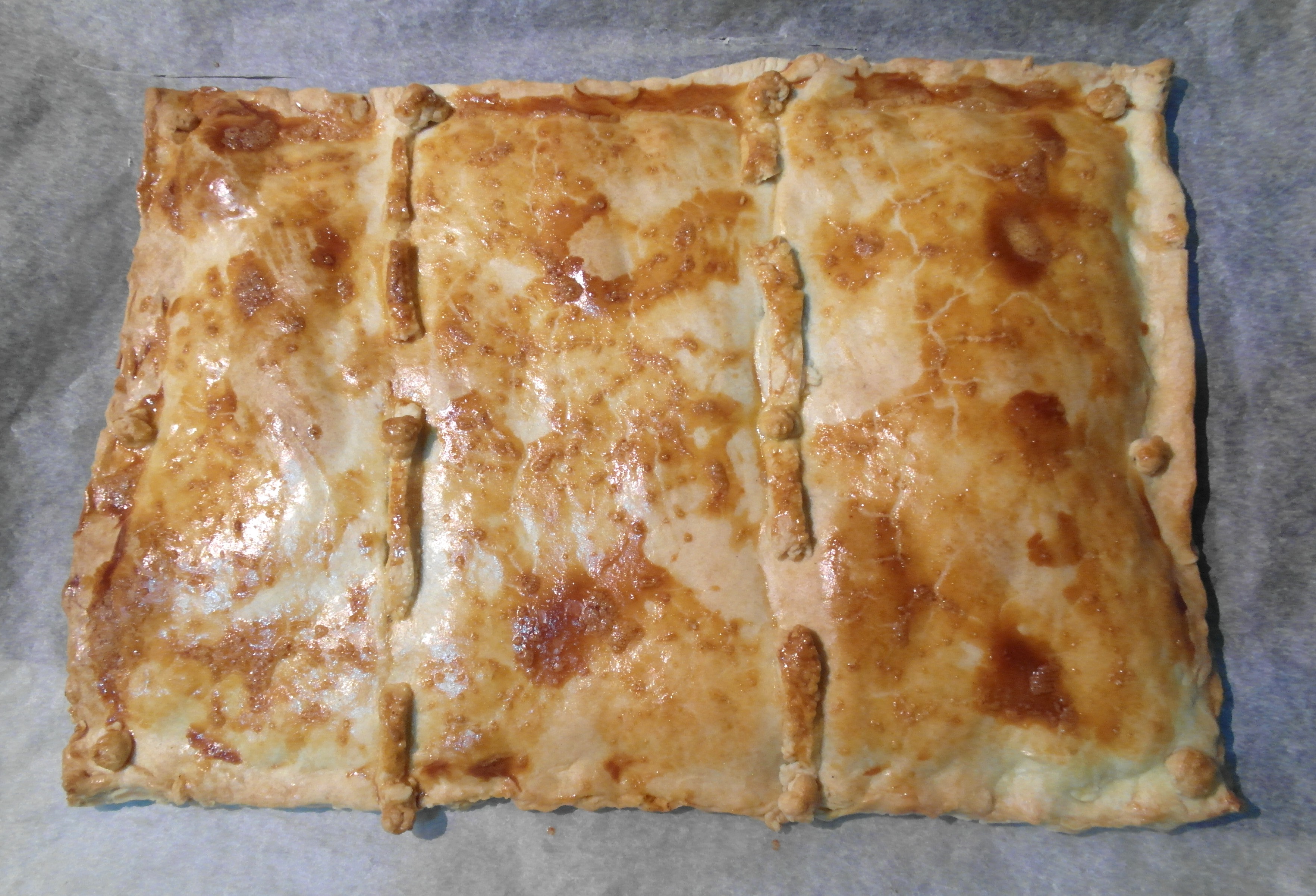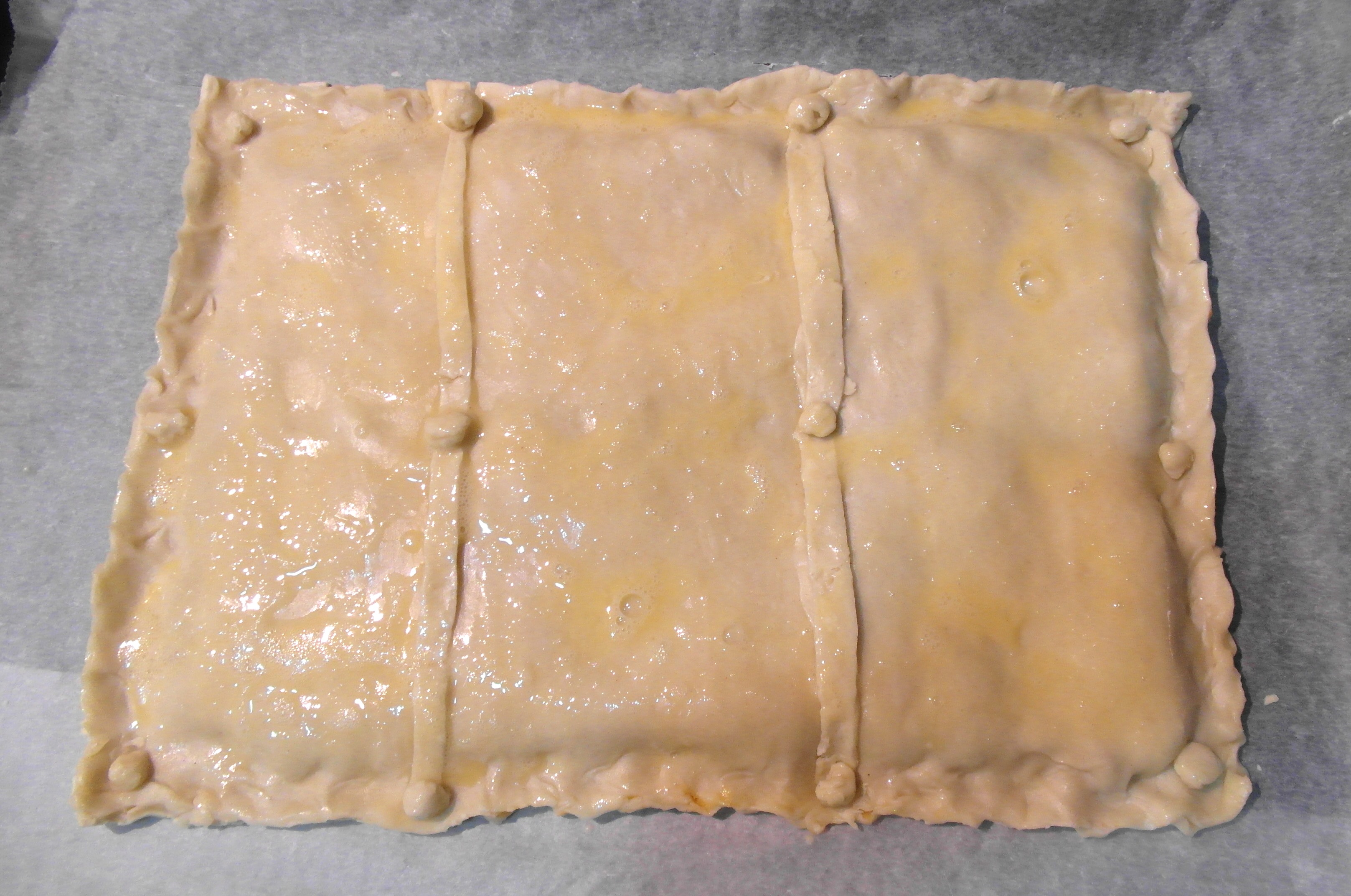 Colocamos encima la otra capa de masa estirada para cubrir. Con los restos de masa hacemos tiritas y bolitas para decorar. Pintamos con huevo batido y la metemos en el horno precalentado a 180º.