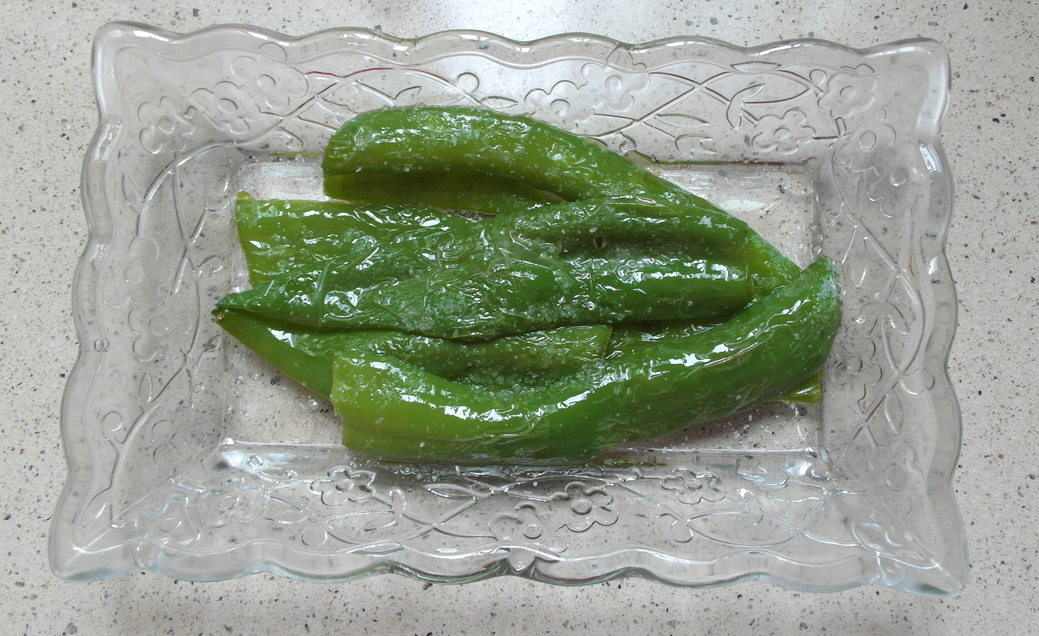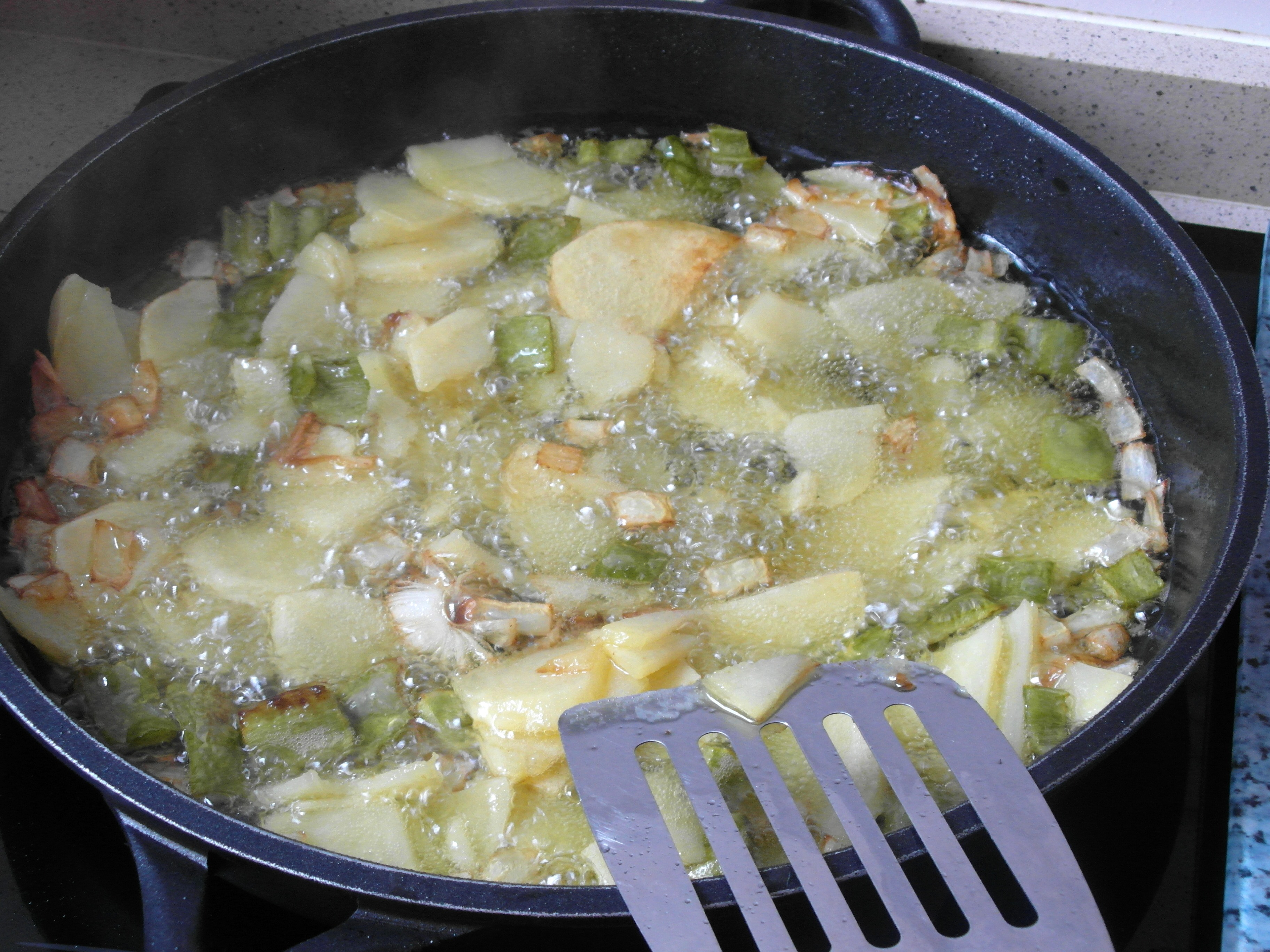 Pelamos y cortamos las patatas en rodajas. Cortamos la cebolla y dos pimientos en trocitos y los refreímos en una sartén. Añadimos las patatas y las mezclamos, dejándolas hacer hasta que estén tiernas. Salamos a gusto.