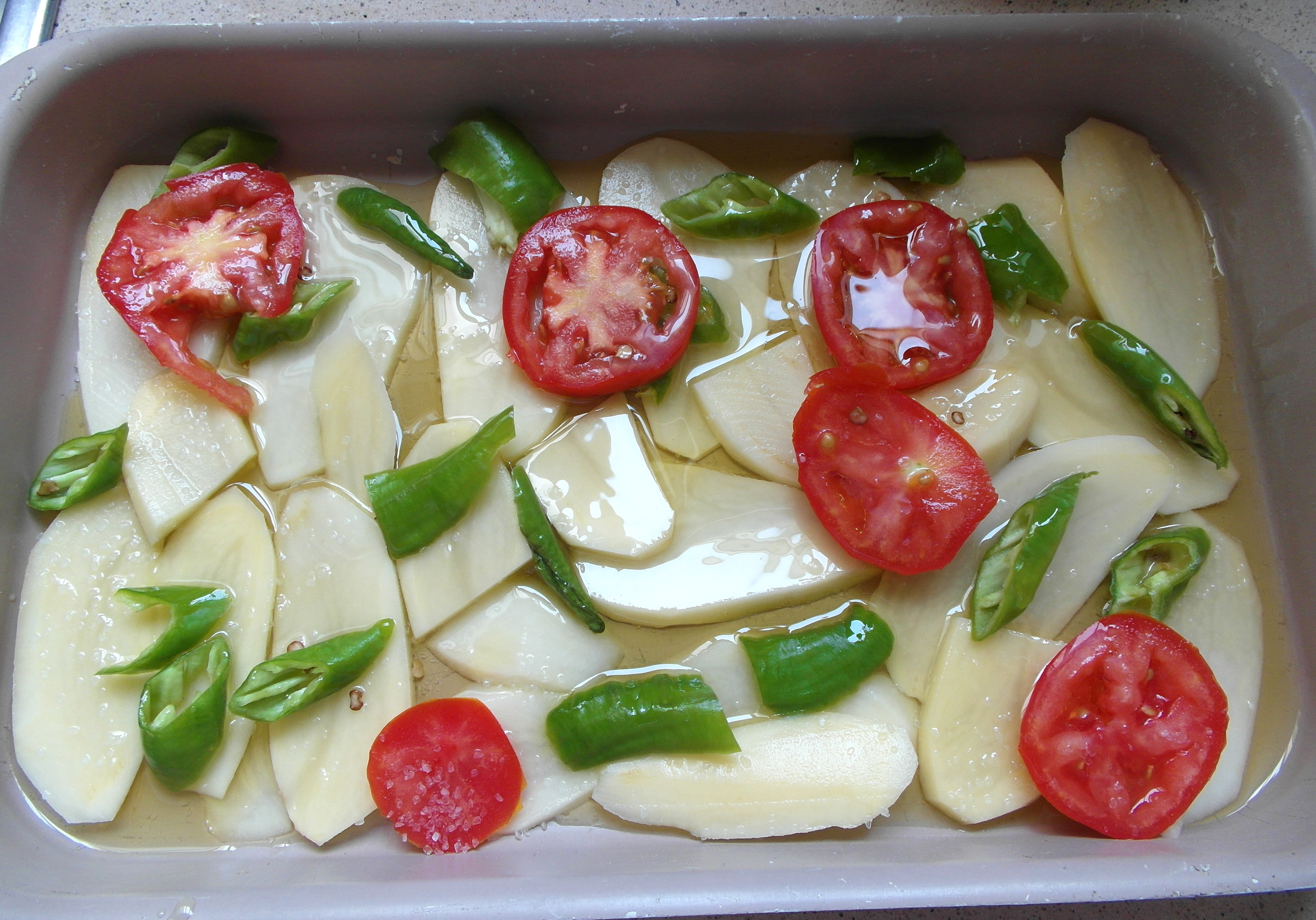 Pelamos y cortamos las patatas y los ajos. Cortamos el tomate, la cebolla y los pimientos. Lo colocamos en el fondo de una bandeja de horno. Echamos por encima aceite y sal. Calentamos el horno y metemos la bandeja, para que se vayan haciendo las patatas, ya que son más duras que la merluza.