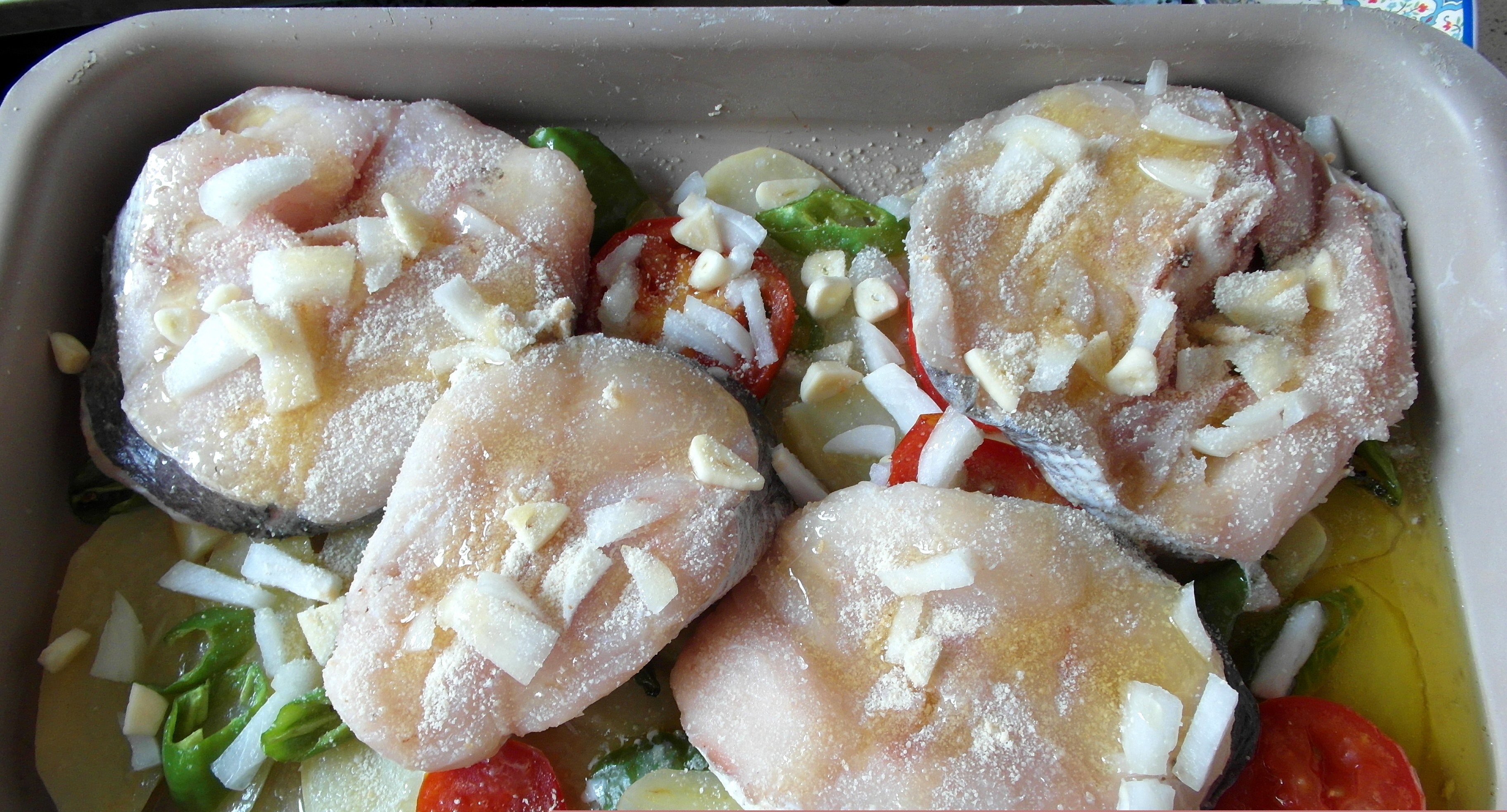 La sacamos cuando veamos que están casi tiernas y sobre esta capa colocamos las rodajas de merluza, con los ajitos, pan rallado, sal y un chorro de aceite por encima.