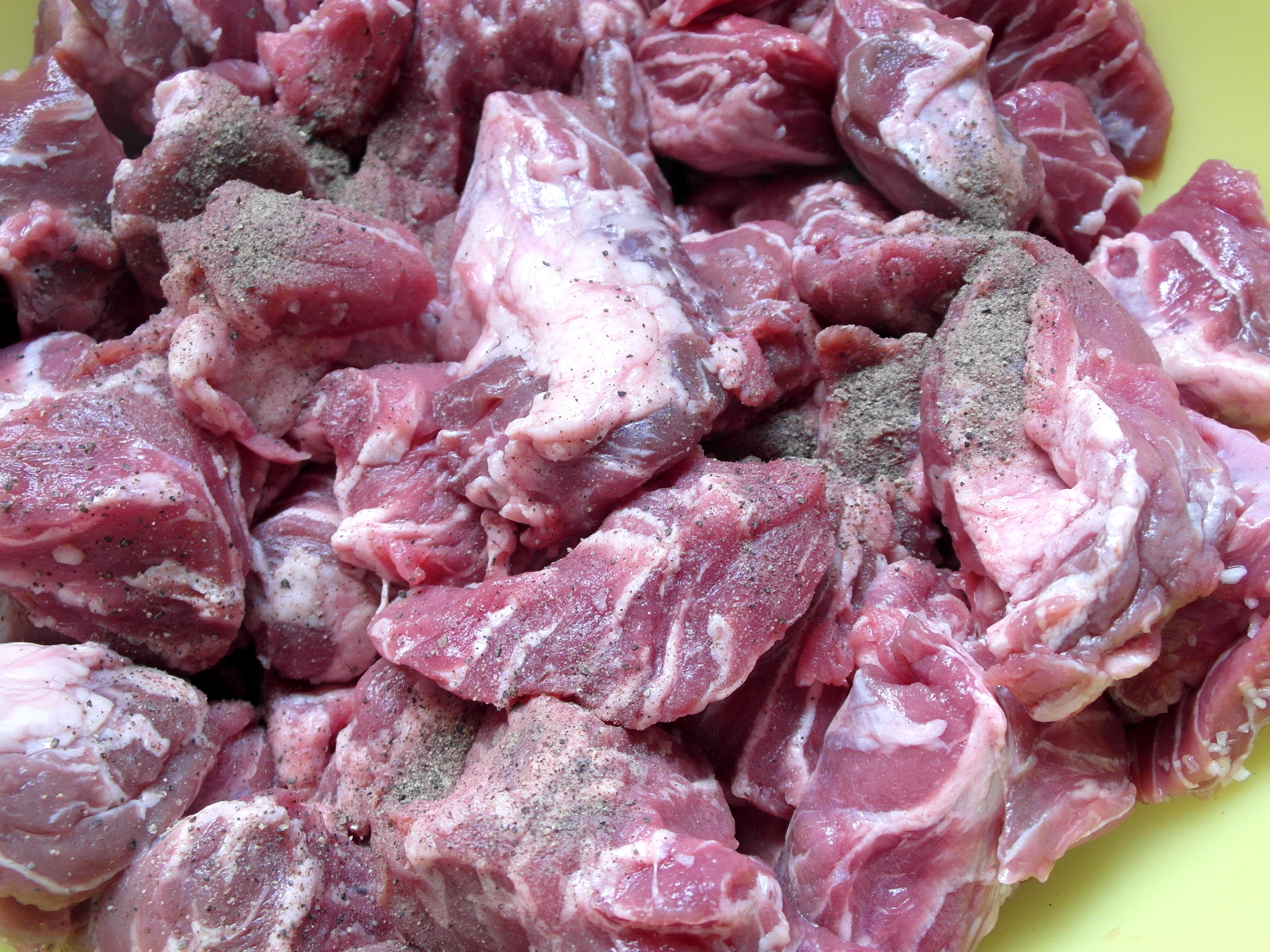 Le decimos al carnicero que nos limpie las carrilleras, quitándoles las partes blancas, y las troceamos. Les echamos sal y pimienta molida.