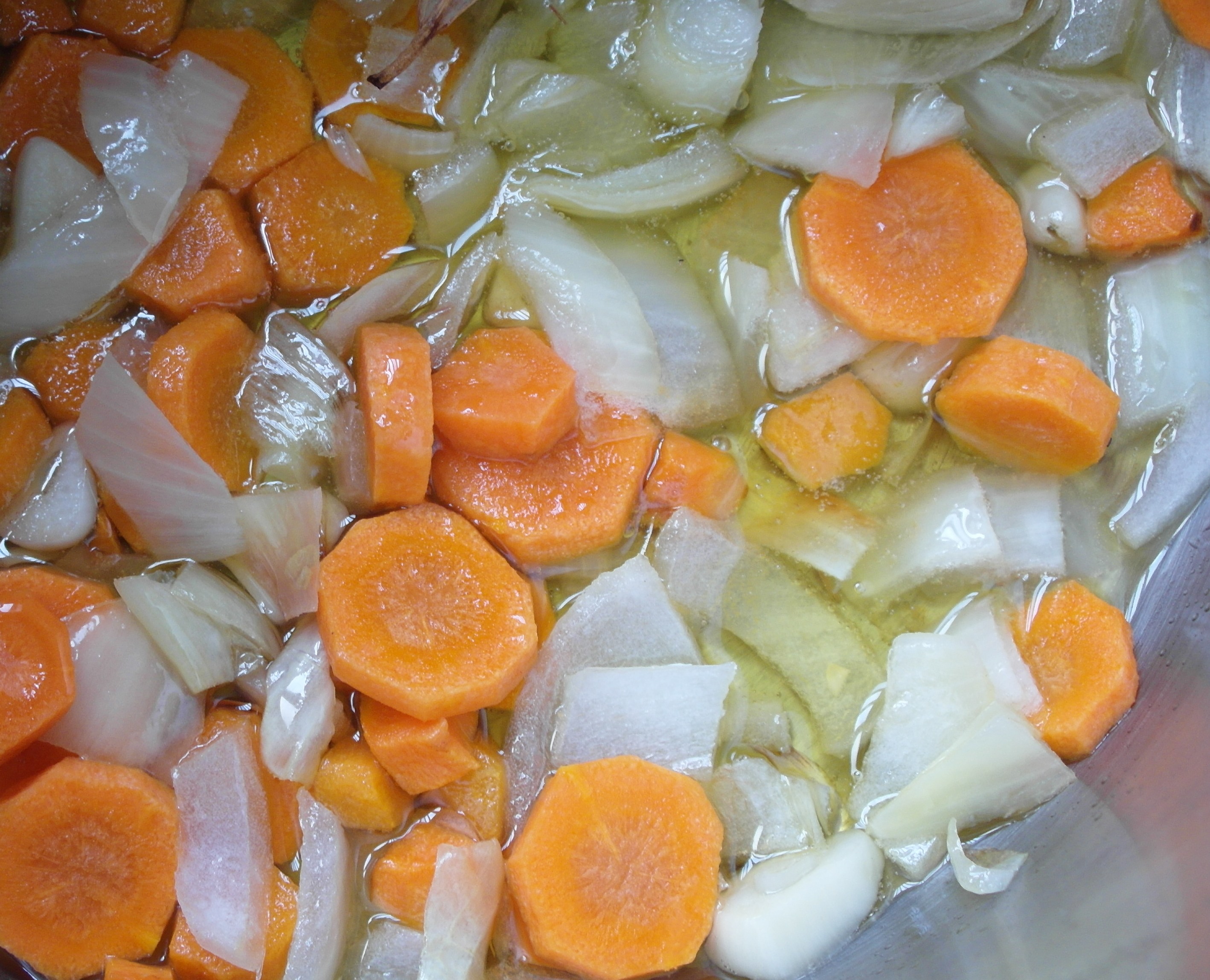 Troceamos también las zanahorias, cebolla, puerro y ajos. Los pasamos por aceite en una sartén hasta que se doren.