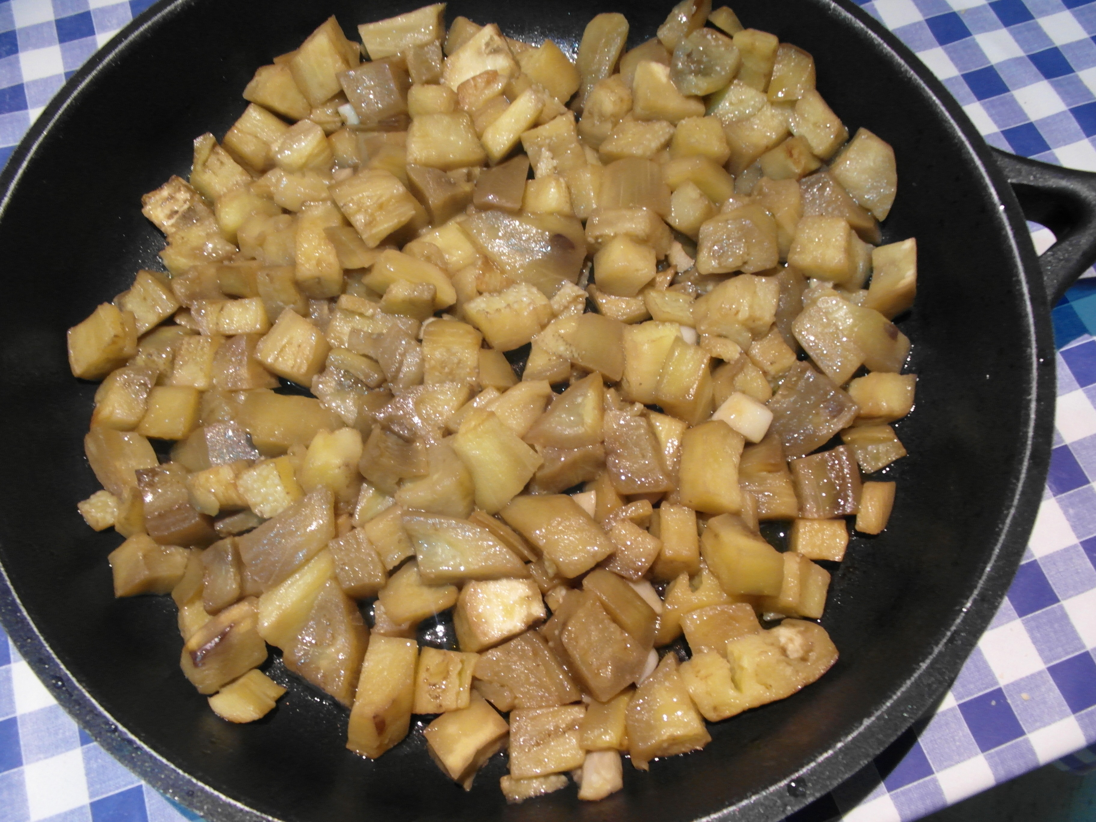En primer lugar pelamos las berenjenas y las cortamos en trocitos. En una sartén freímos los ajos pelados y cortados, y a continuación hacemos lo mismo con la berenjena.Echamos un poco de agua y vino y las dejamos cocer hasta que estén tiernas. Las sacamos y aplastamos con un tenedor.