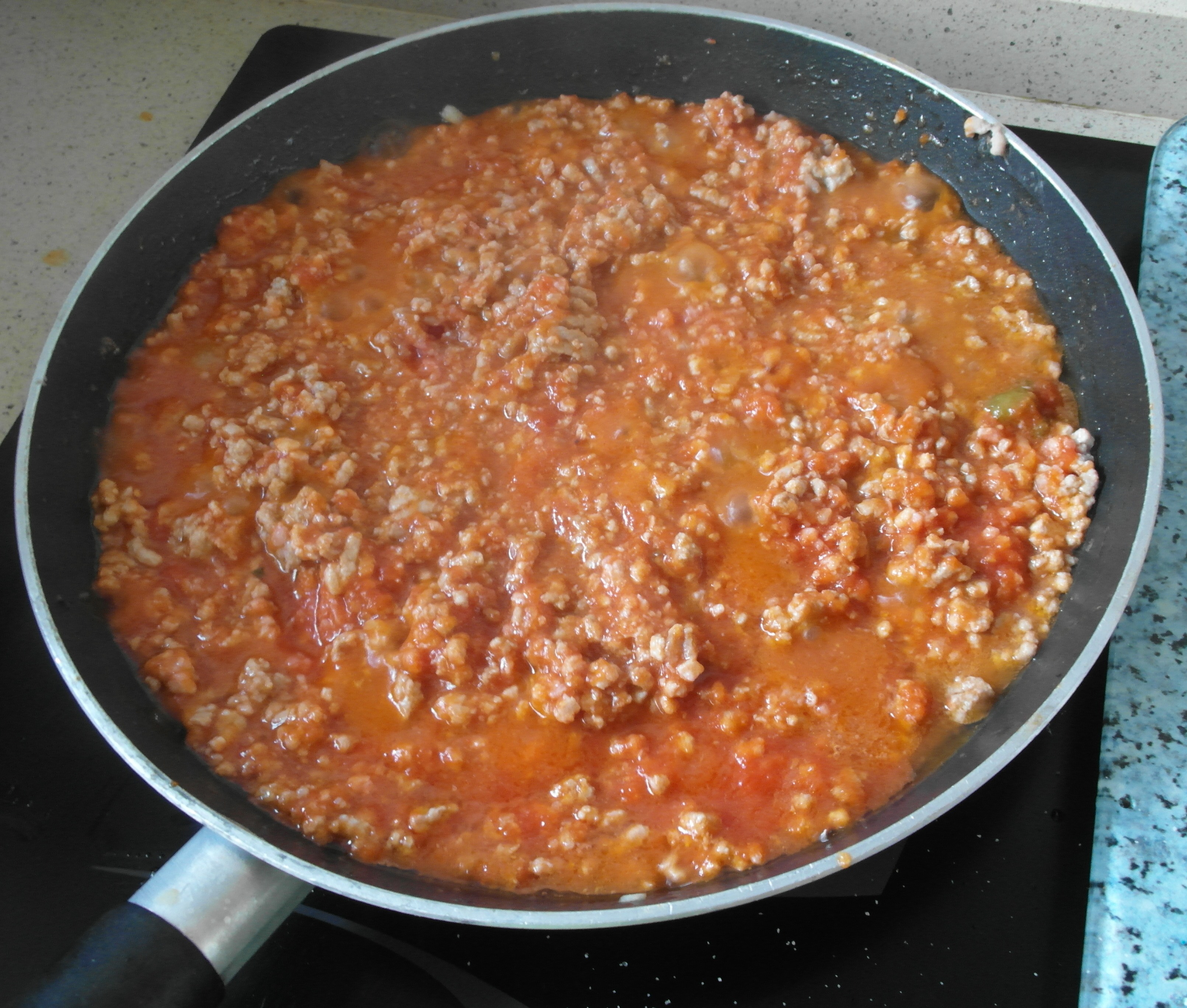 En la misma u otra sartén refreímos la carne con ajito picado , salamos y añadimos el tomate frito. Lo mezclamos bien.