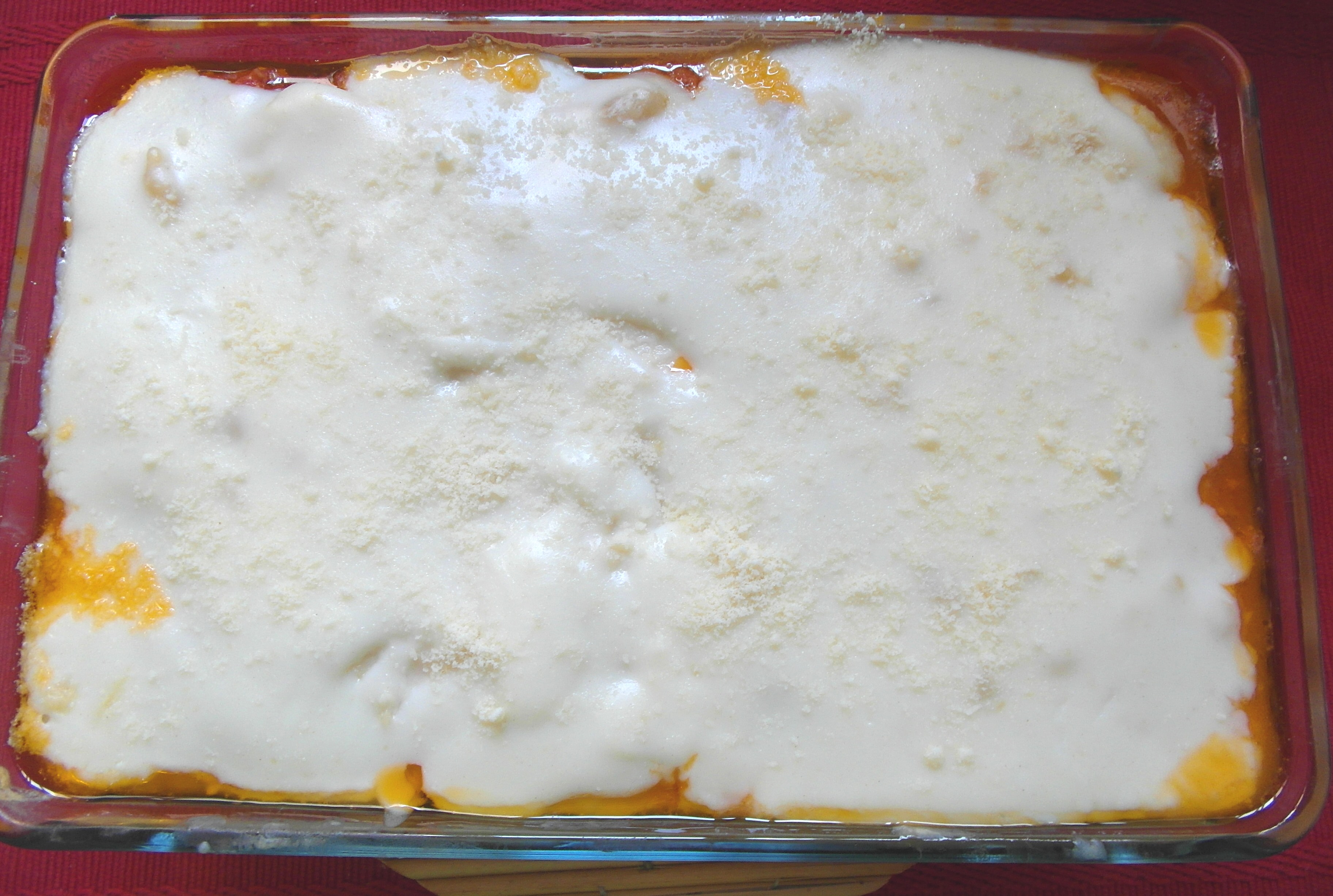 Hacemos una bechamel, como ya he explicado en otras recetas, y cubrimos toda la superficie con ella. Echamos un poco de queso rallado y la metemos en el horno precalentado a 180º.