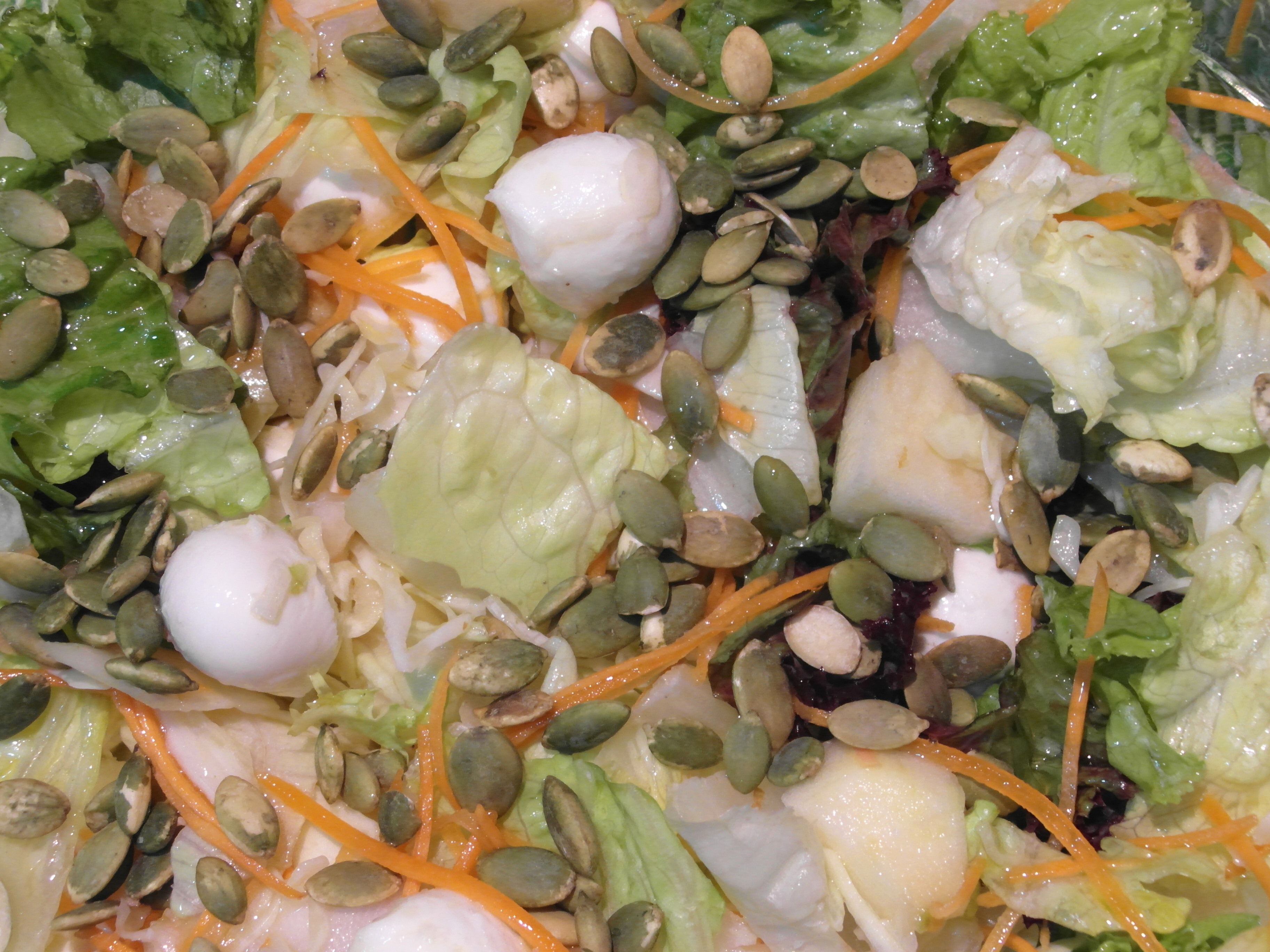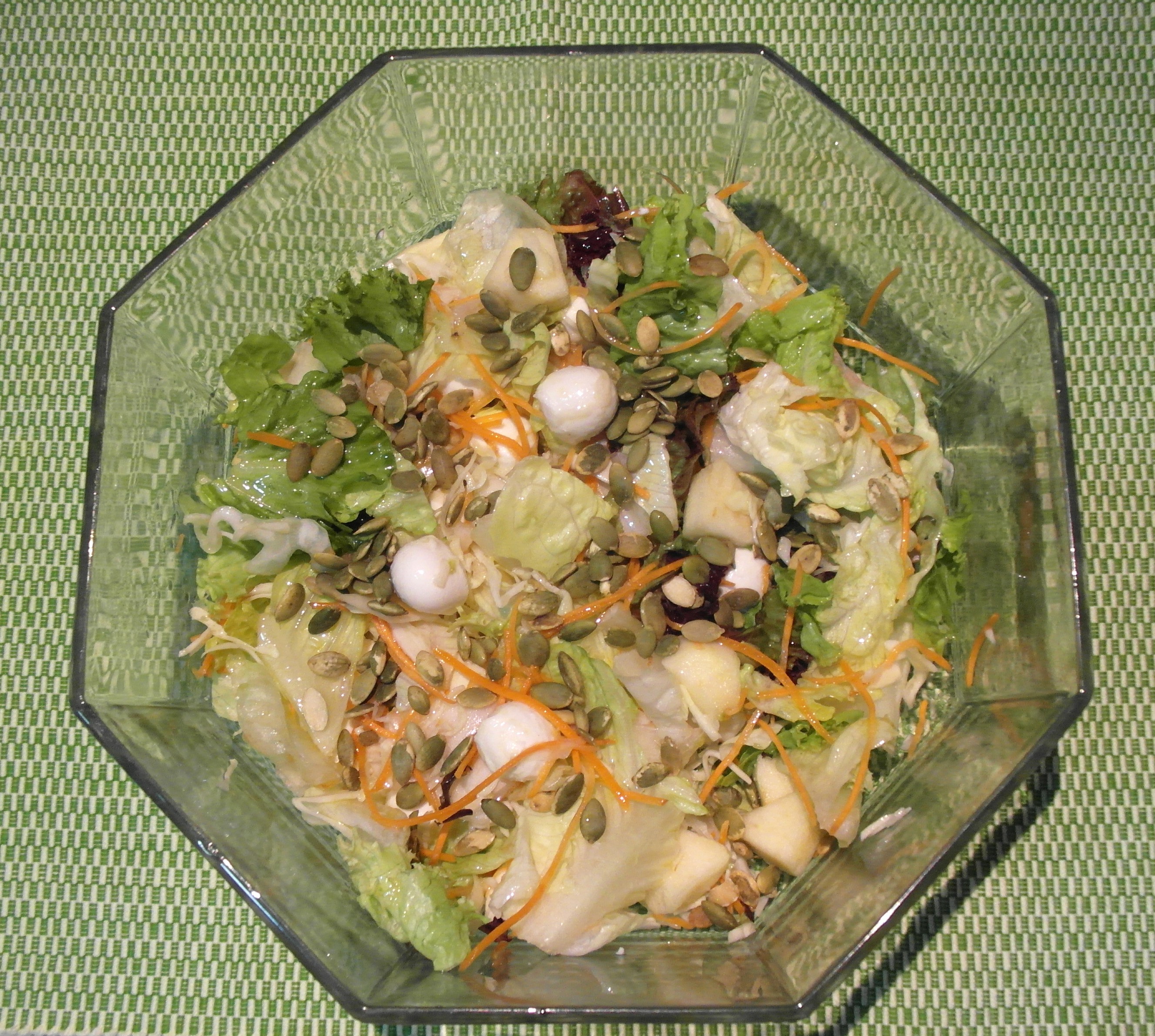 Visto y oído lo dicho, me compré un paquete de pipas de calabaza peladas en el supermercado y las estoy añadiendo a las ensaladas, con la grata sorpresa de que, además aportan un sabor y textura muy agradables. Así que a cualquier tipo de ensalada que hagáis le podéis añadir un puñadito de estas semillas y ya veréis cómo os gusta el resultado. Aquí van los ingredientes de una ensalada, pero podéis poner lo que queráis,los ingredientes que se suelen poner en una ensalada, es decir…muchísimos y variados.
