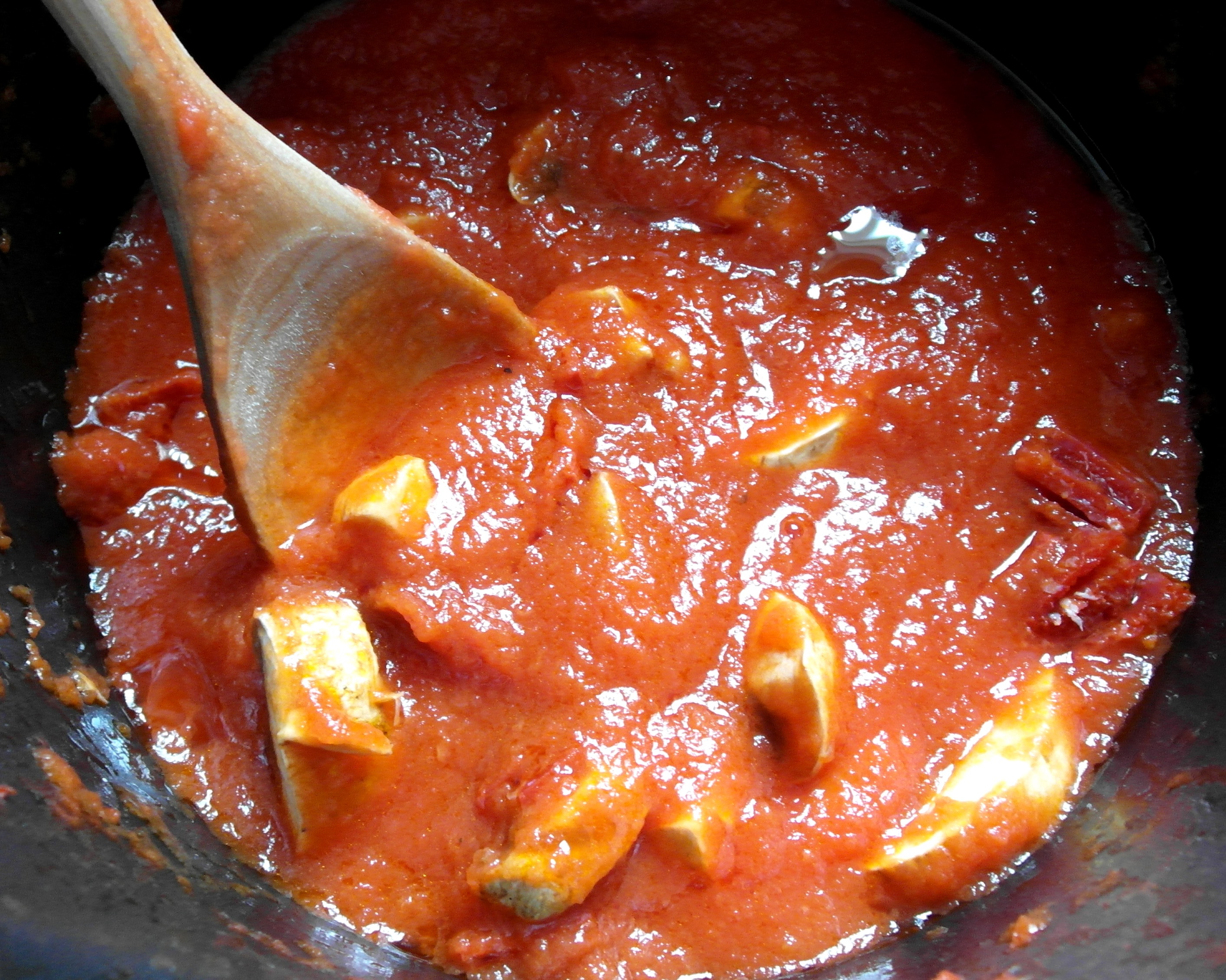Cortamos los champiñones en trocitos. En una sartén los refreímos junto con el chorizo. Añadimos el tomate frito y lo mezclamos bien.