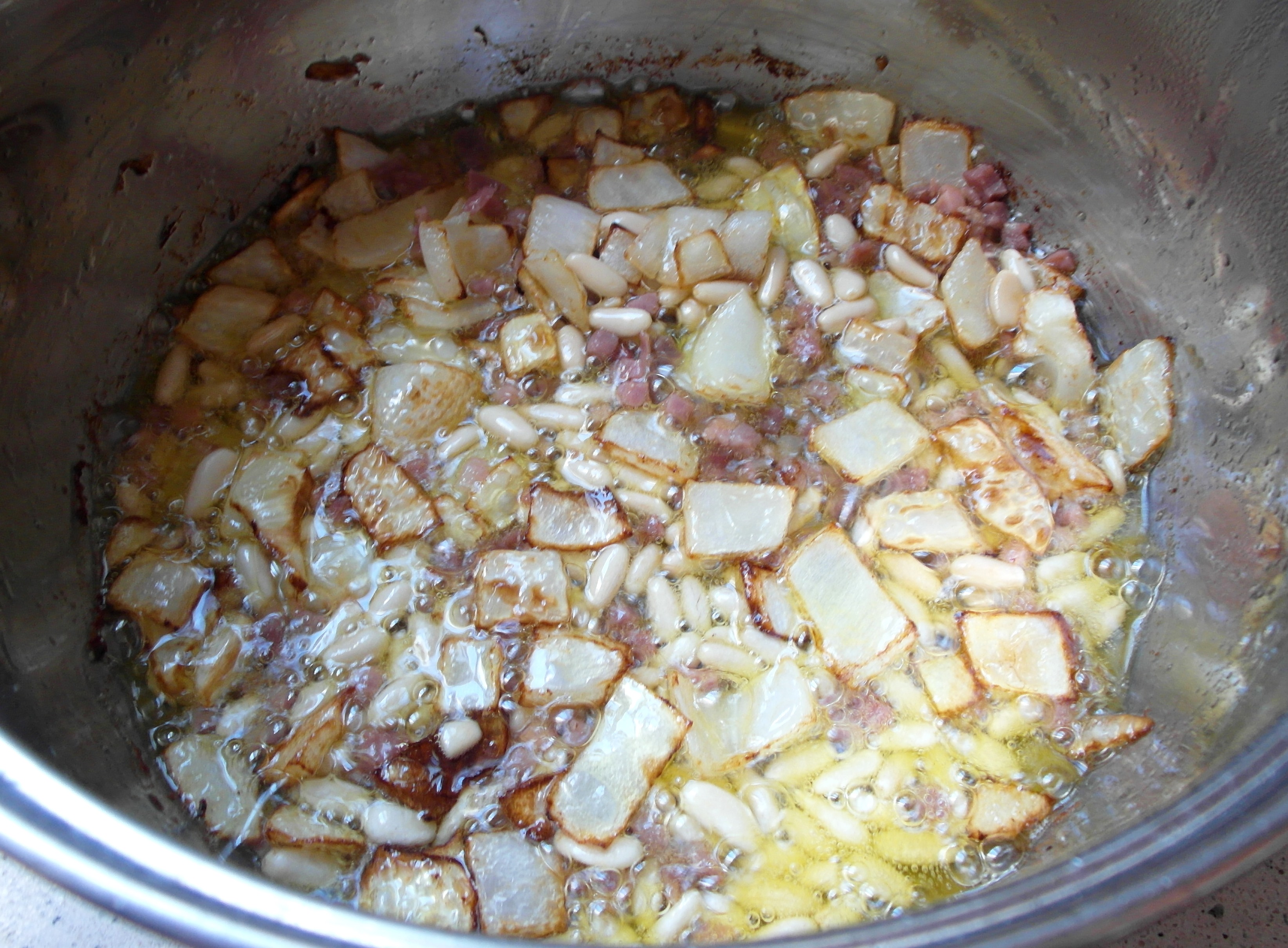 Para hacer la salsa freímos cebolla en un poco de aceite, añadimos el jamón y los piñones y sofreímos un poco todo.