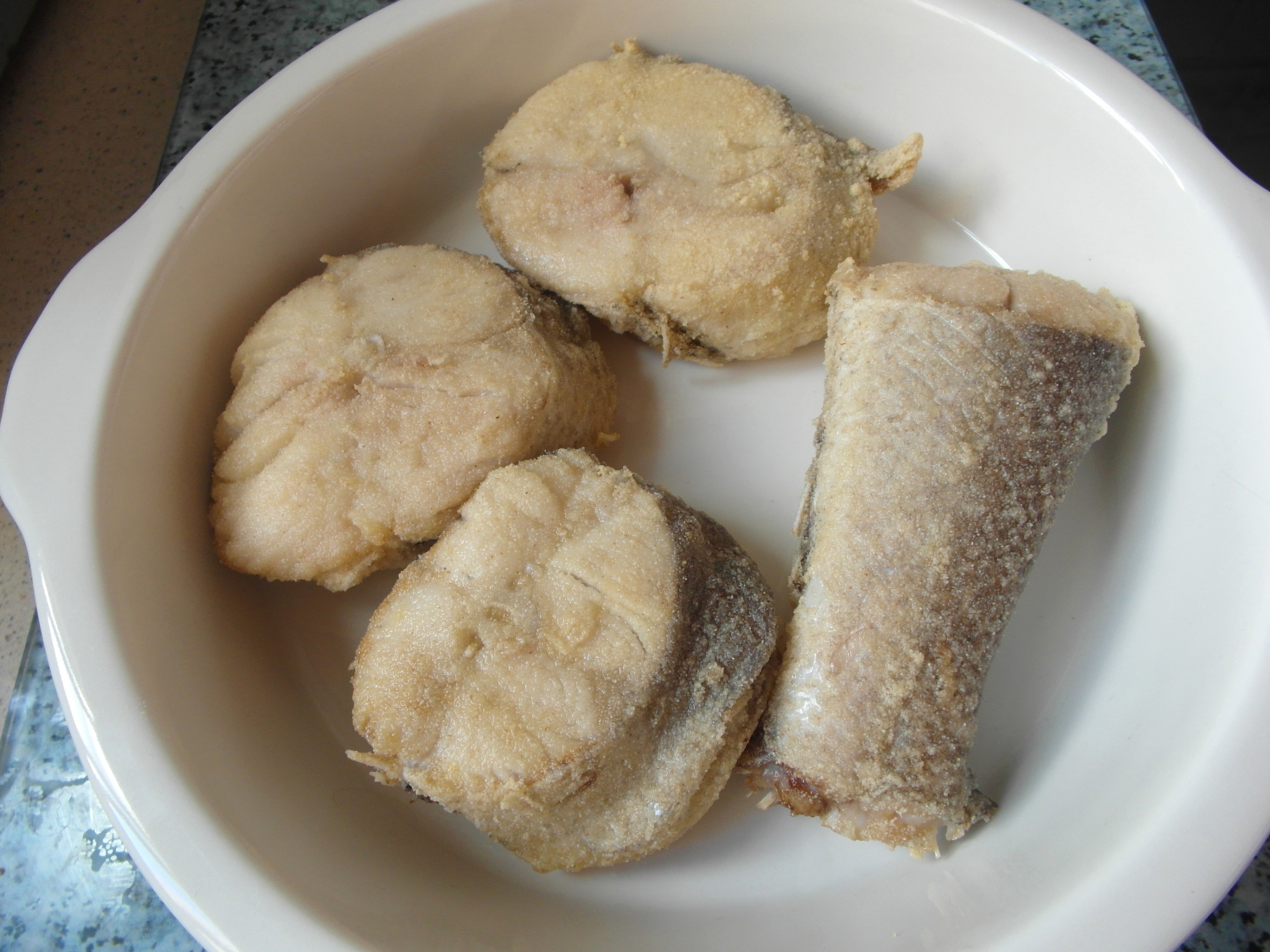 Enharinamos los trozos de merluza y los freímos un poco. Los dejamos apartados.