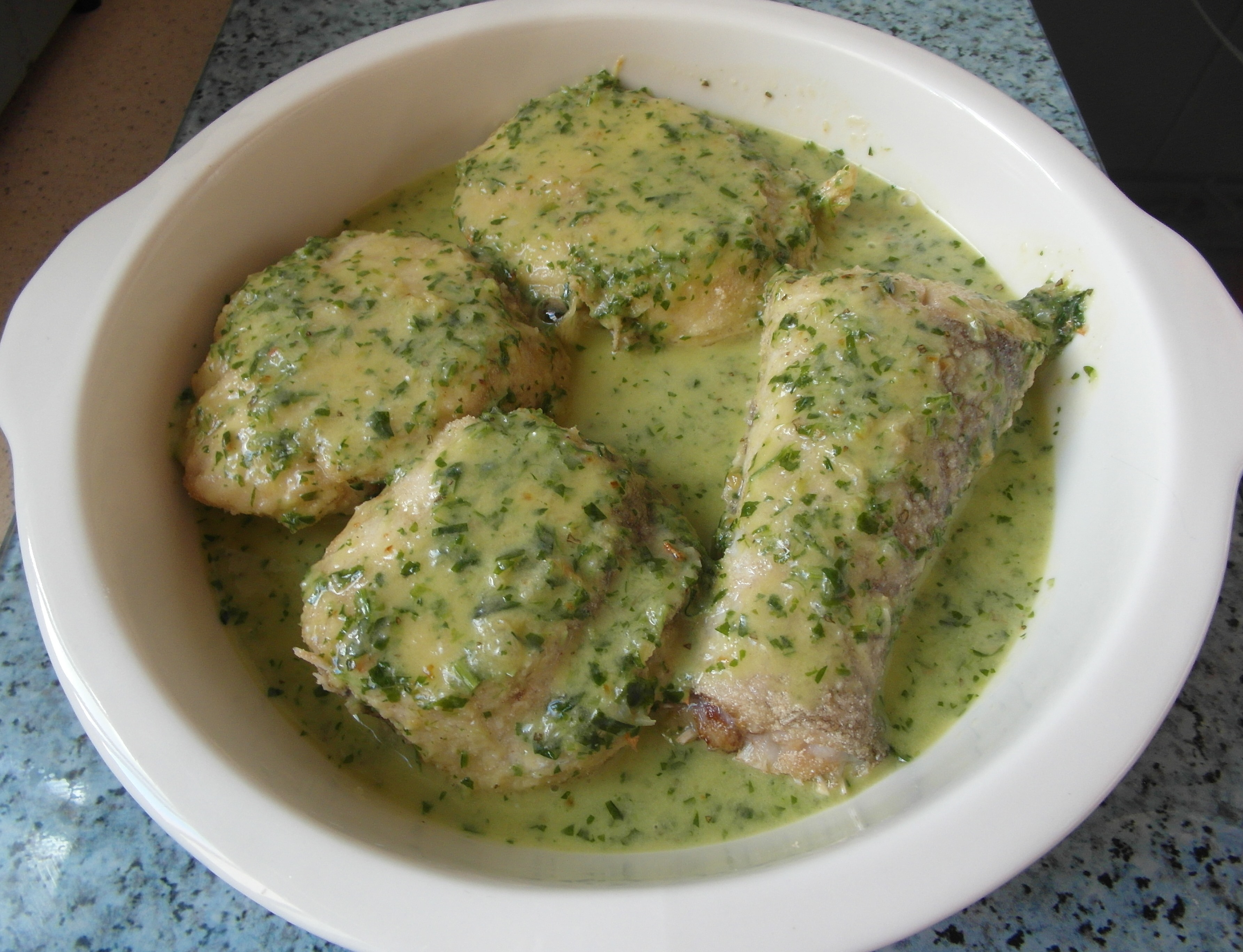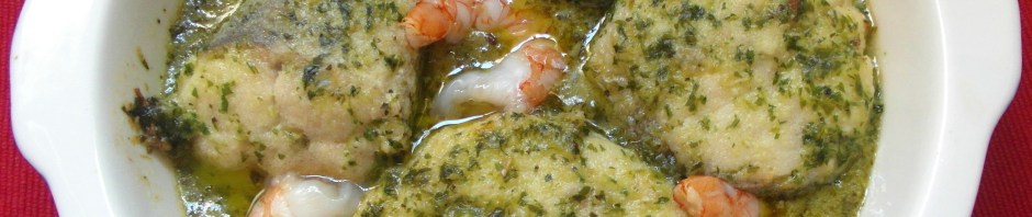 Ponemos la merluza en una bandeja de horno junto con los gambones pelados, y echamos por encima la salsa que hemos batido.