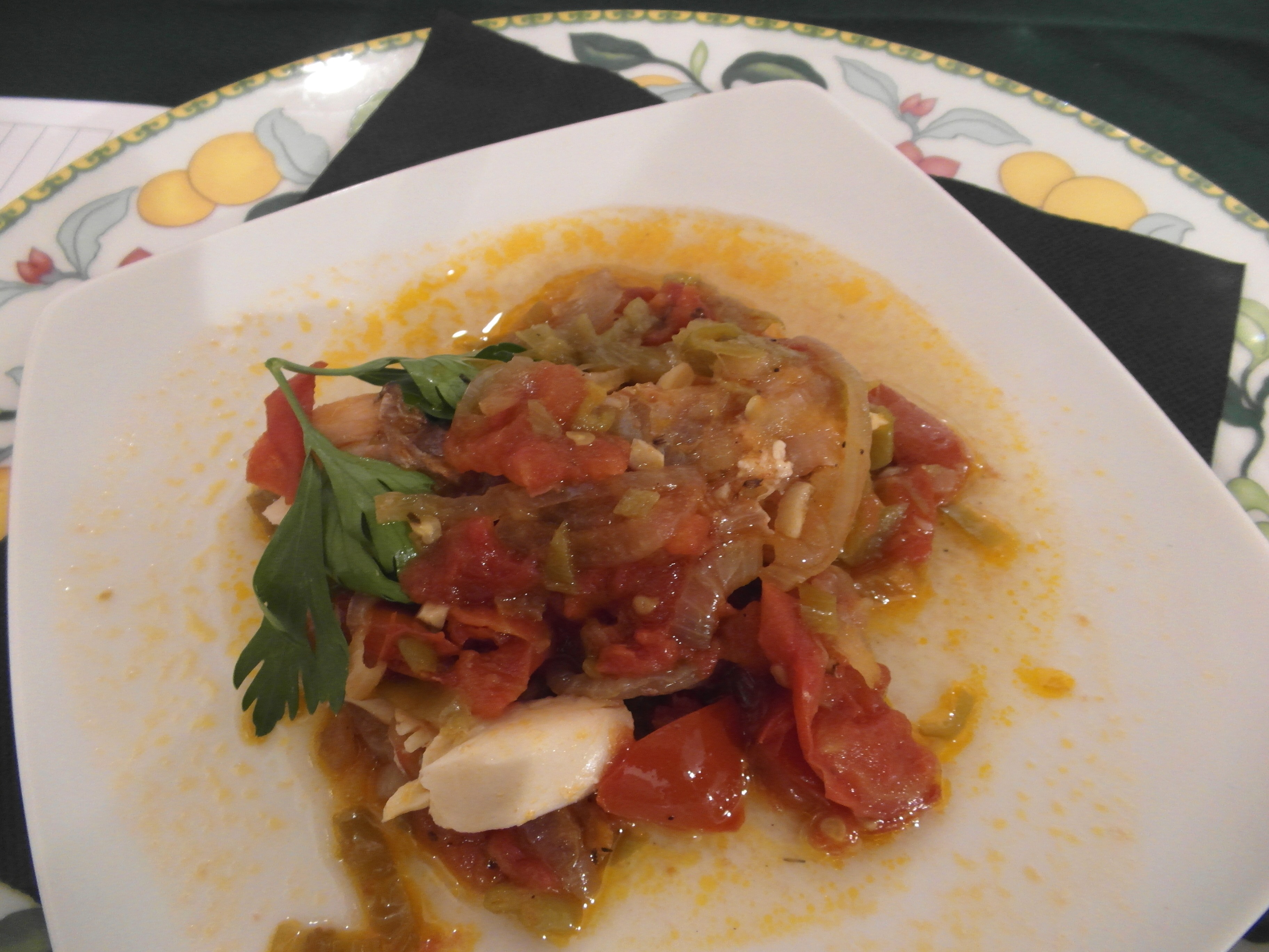 Se coloca encima la urta y se rocía con zumo de limón. En los cortes se colocan rodajas de tomate, y por encima cebolla, pimientos verdes y más tomate, todo picado. Se le echa un chorro de aceite, pimienta y nuez moscada. Ya está lista para meter en el horno suave.