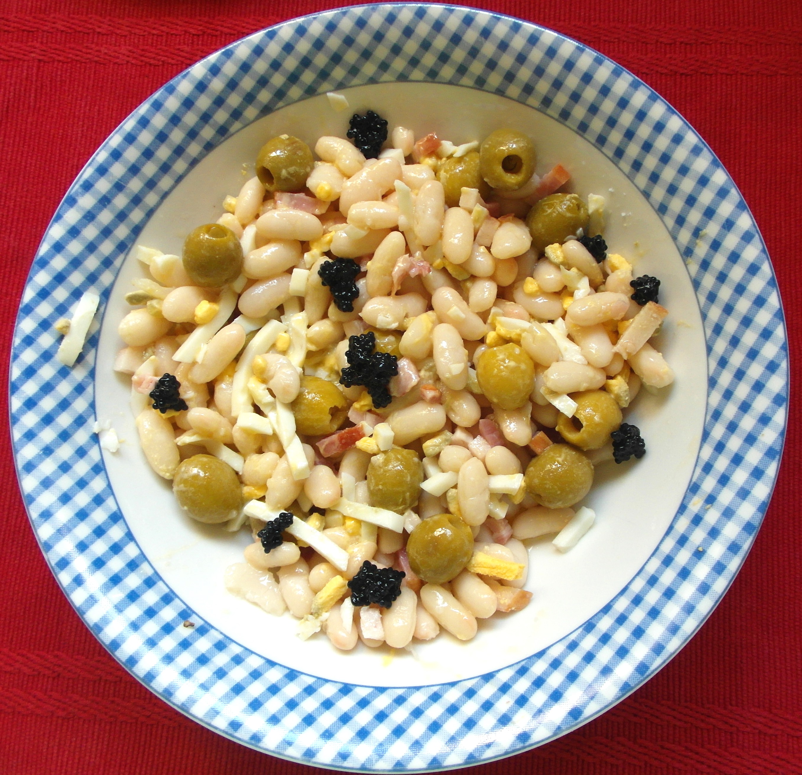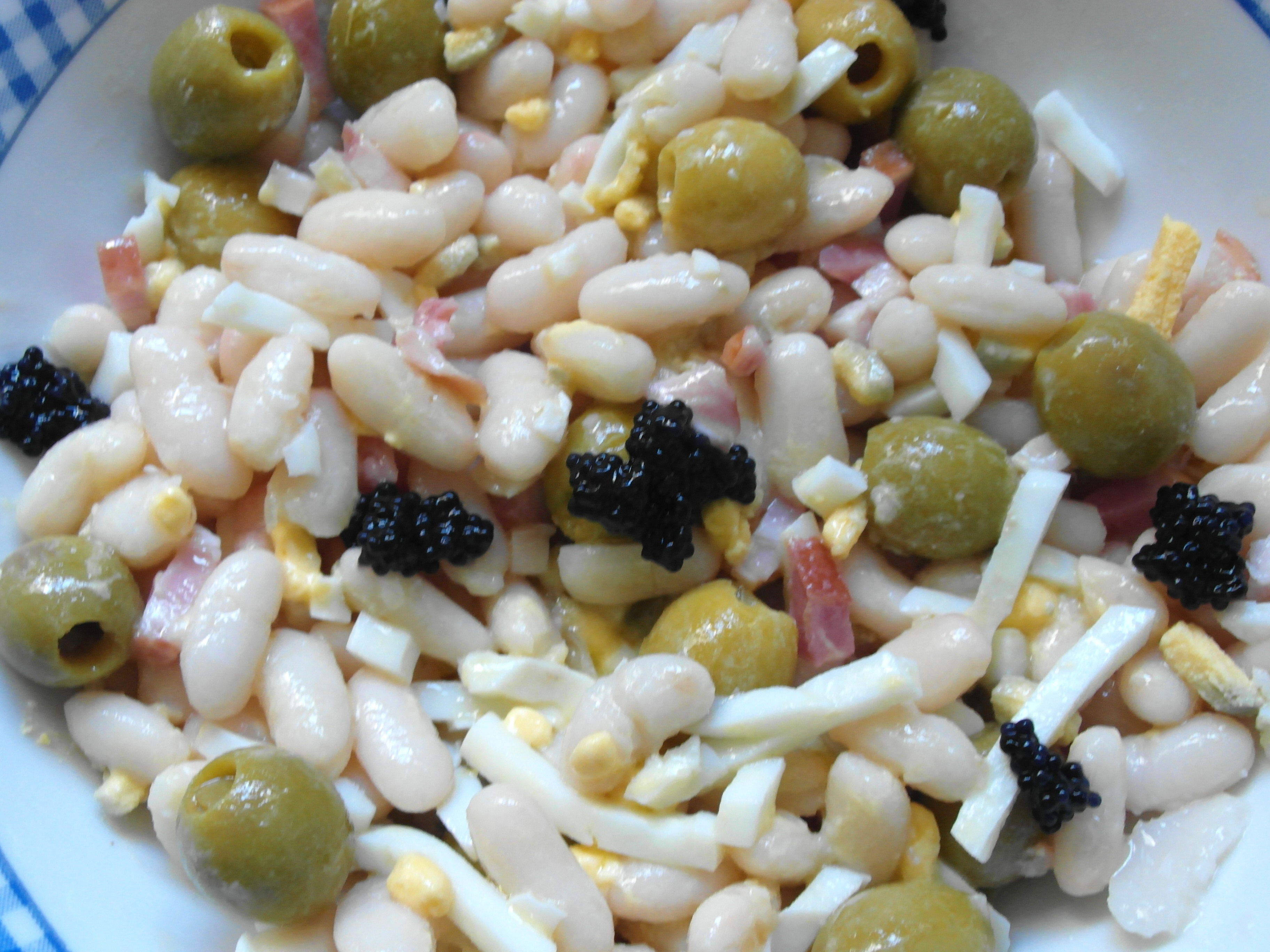 Se añaden los demás ingredientes menos las huevas de lumpo, y se aliñan con sal, vinagre y aceite en este orden.