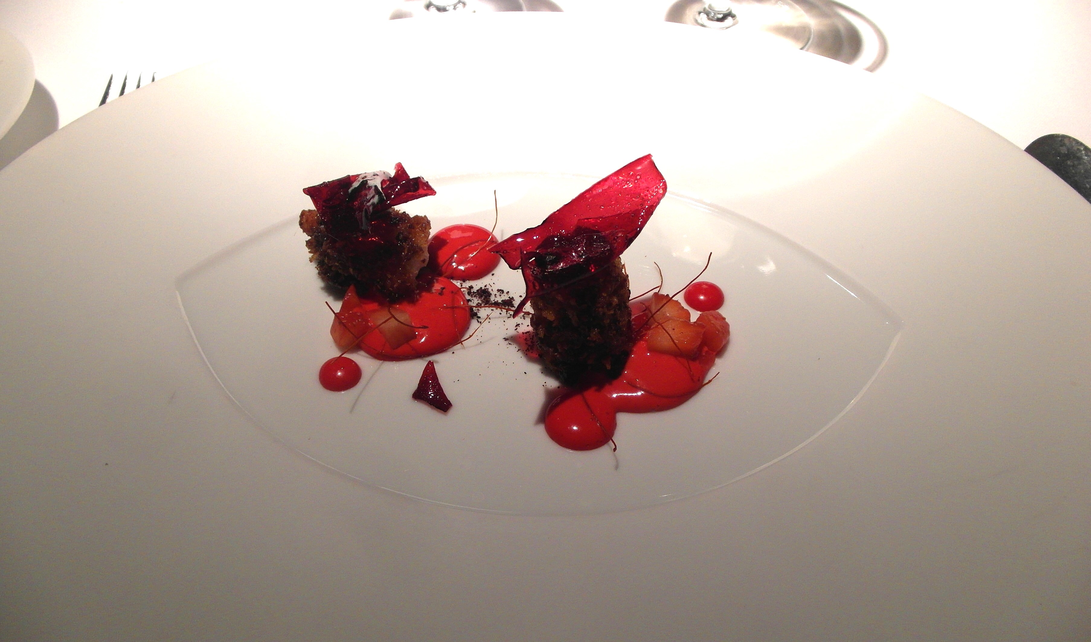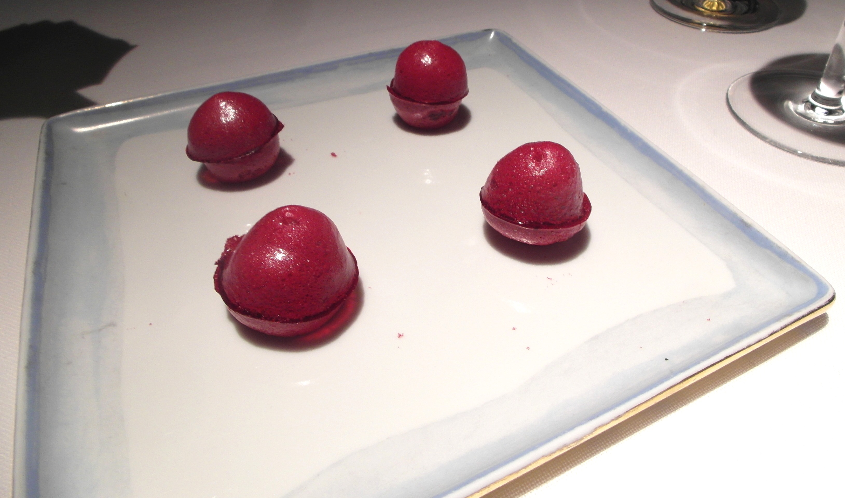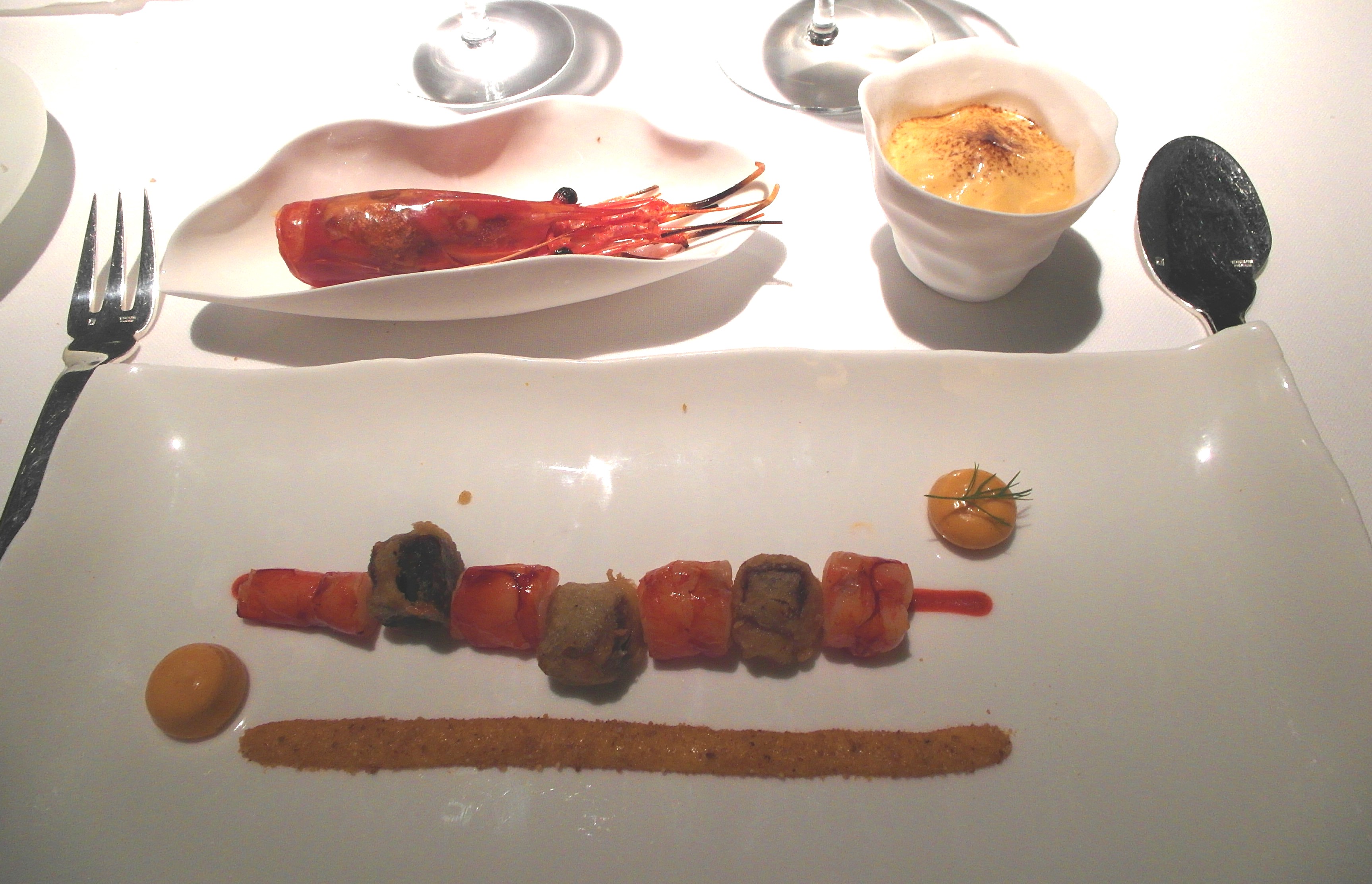 El menú consta de catorce platos que acompañamos con un vino blanco Riesling 2012, Dönnhoff, excelente.
