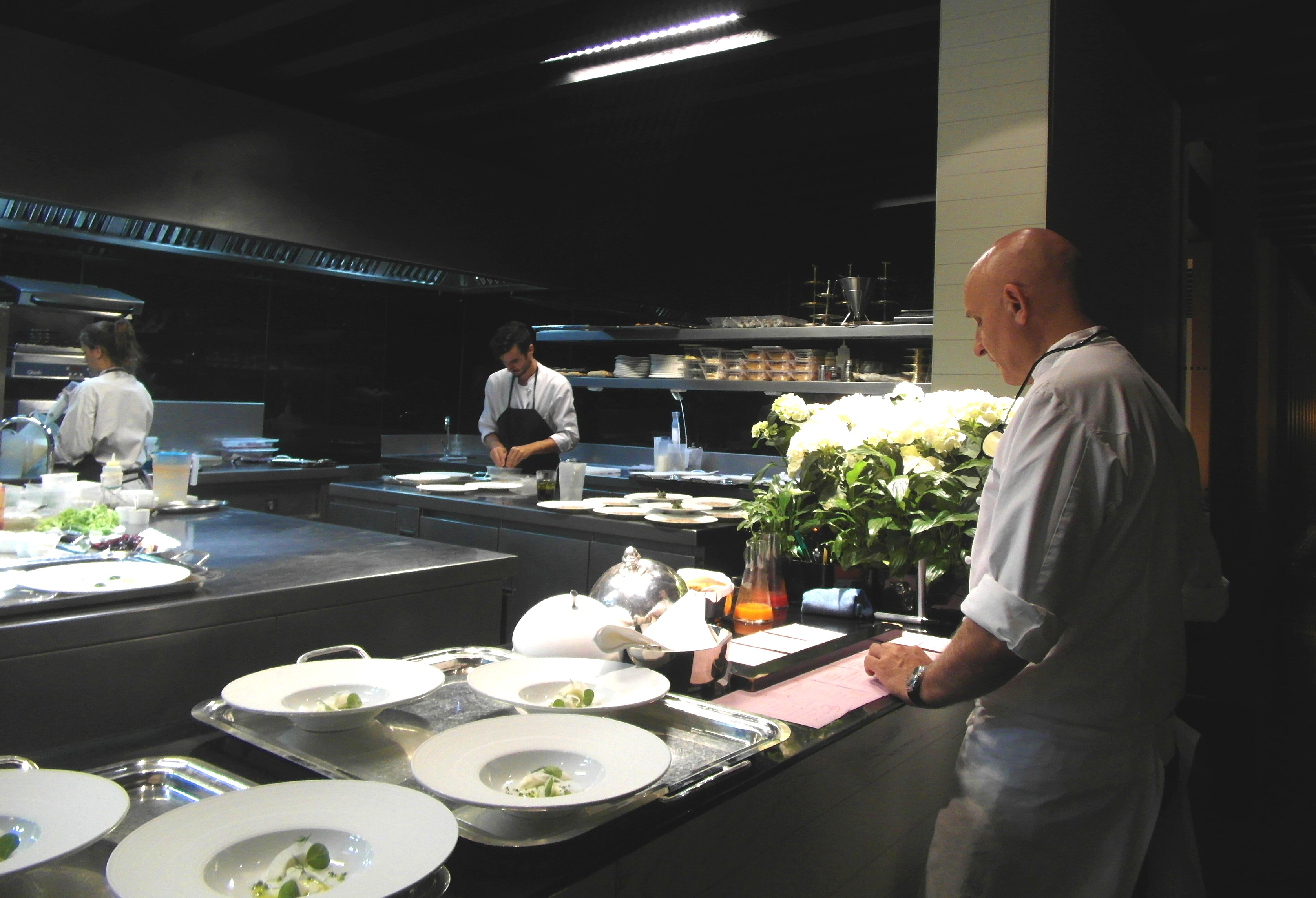 Hablemos primero de sus creadores,como hablamos del pintor antes de analizar su obra, el chef Toño Pérez y el empresario José Polo, ambos cacereños. El primero se dedica a la cocina, eligiendo las materias primas, los ingredientes, creando los platos, pendiente siempre de que todo marche bien en esta zona del restaurante tan importante, la cocina. En ella me recibió con simpatía y amabilidad, «puedes hacerlas fotos que quieras, entrar y salir cuando quieras», me dijo el chef que ya reúne dos estrellas Michelín.