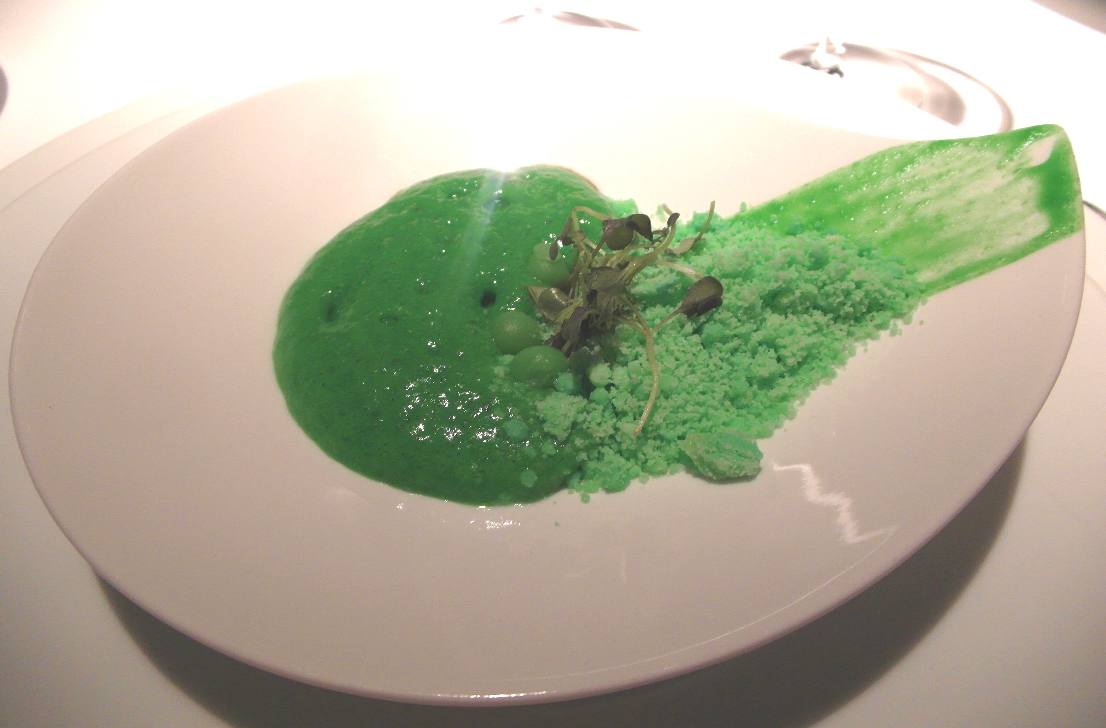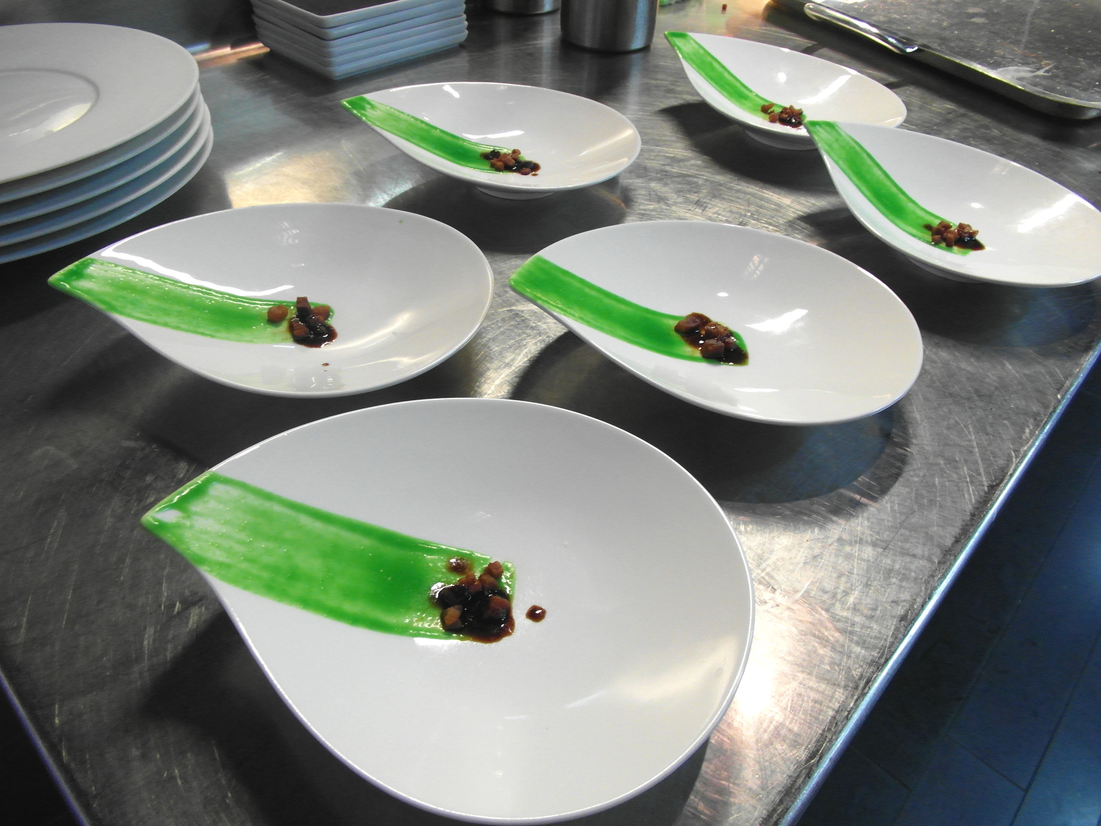 Guisantes falsos, cochinillo crujiente y crema de guisantes