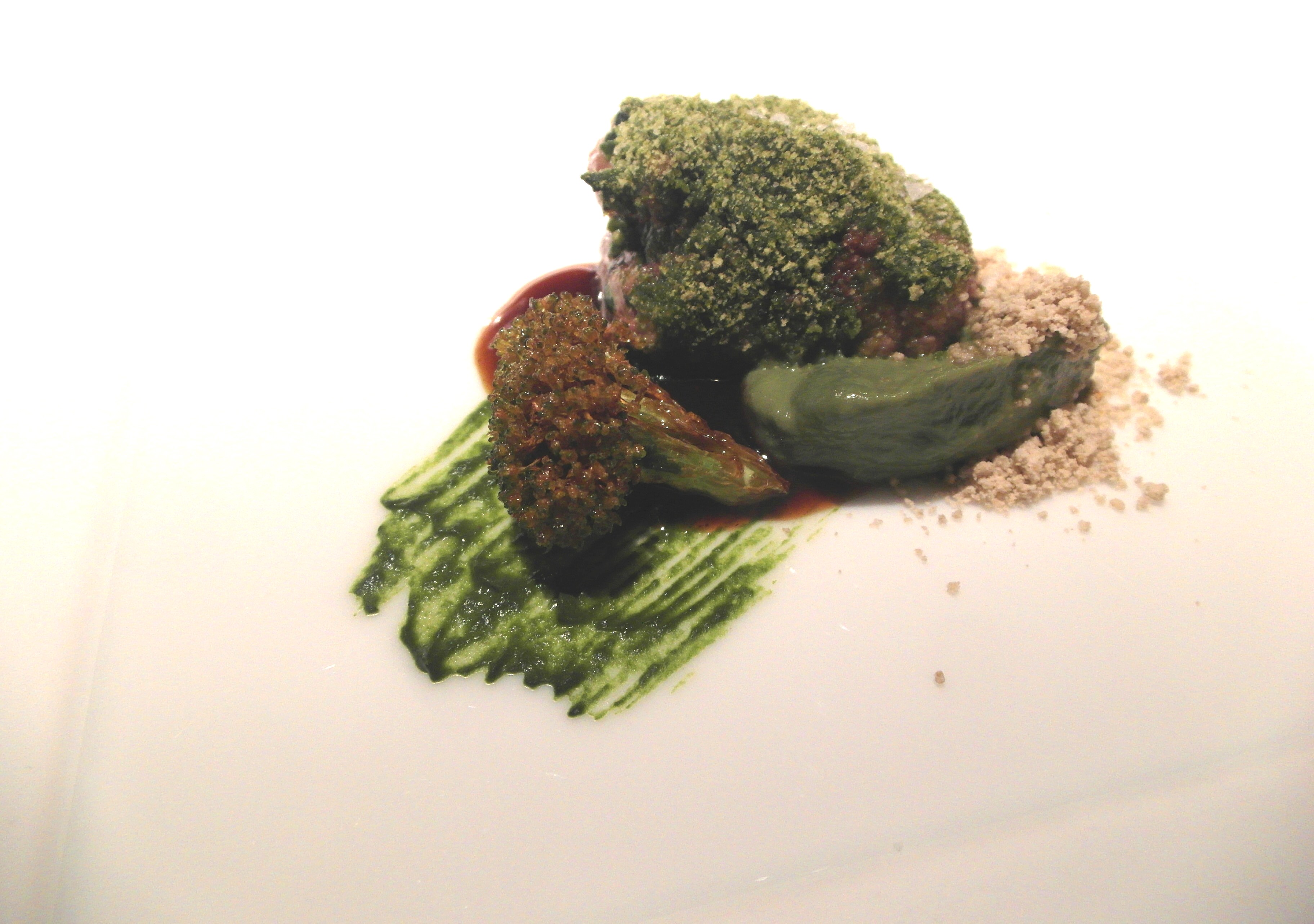 Cigala verde con pan de algas y aceite de oliva sólido