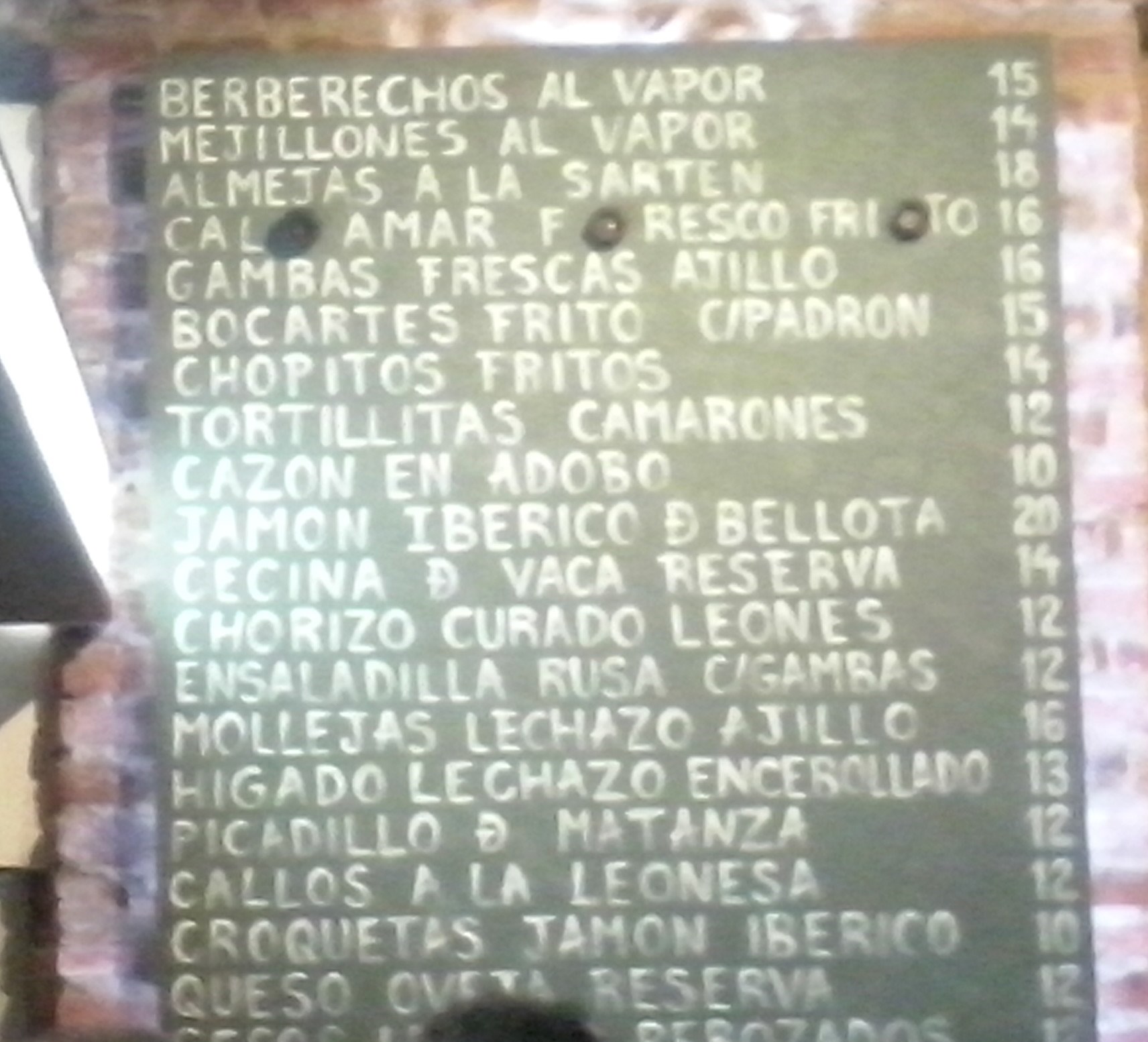 Llegó un momento en que necesitaba comer cosas más ligeras, pero un pescadito como el nuestro en León es difícil encontrar, allí se va a comer embutidos, carnes, arroces contundentes…Pero mira por donde en este Barrio Romántico, concretamente en la calle Cervantes, encontramos el bar llamado Camarote Madrid, que nos llamó la atención por su decoración andaluza y las tapas que se anunciaban en la pizarra: calamares,mejillones, bocartes, que son boquerones o pequeñas sardinitas, chopitos…