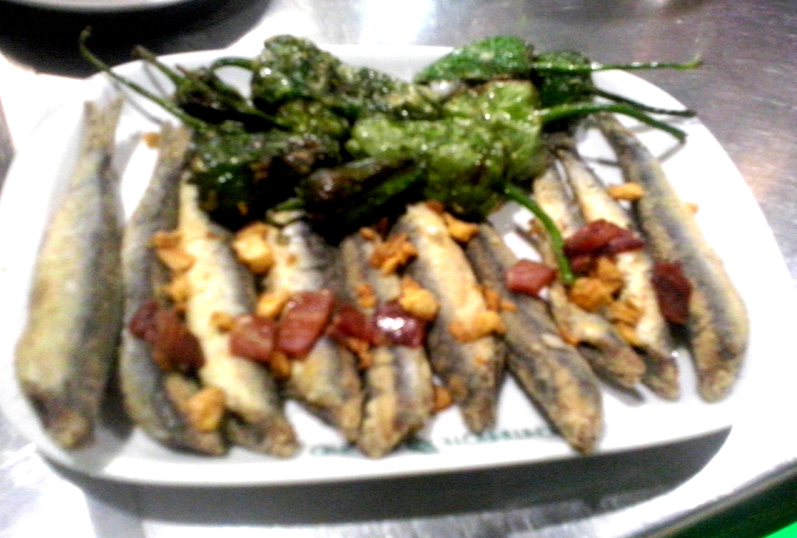 Los bocartes van acompañados de pimientos de Padrón, que unos pican y otros no…Perdonad las fotos que no son buenas, pero ese día no llevaba más que el móvil y había poca luz. Igual de buenos que nuestro boquerones.