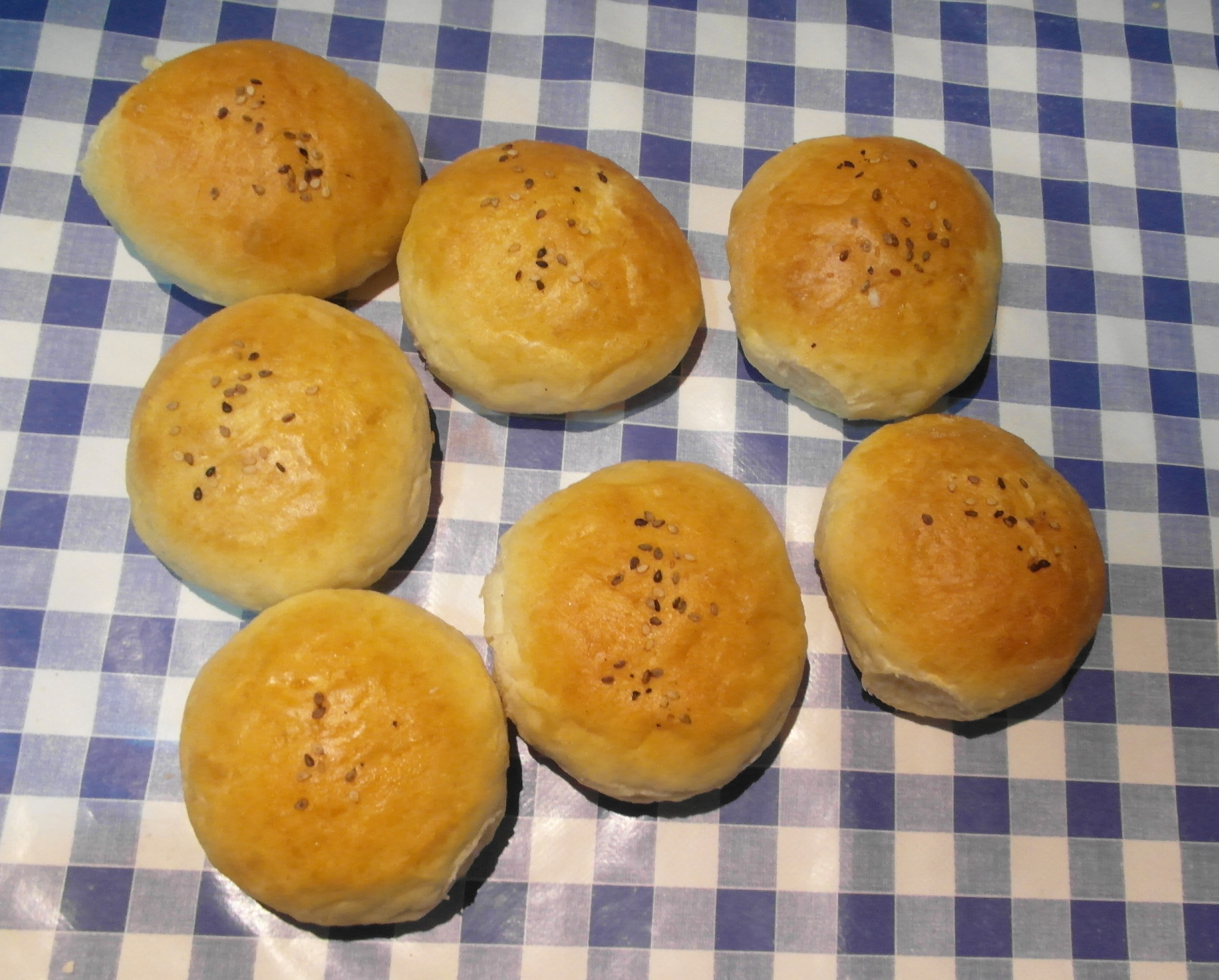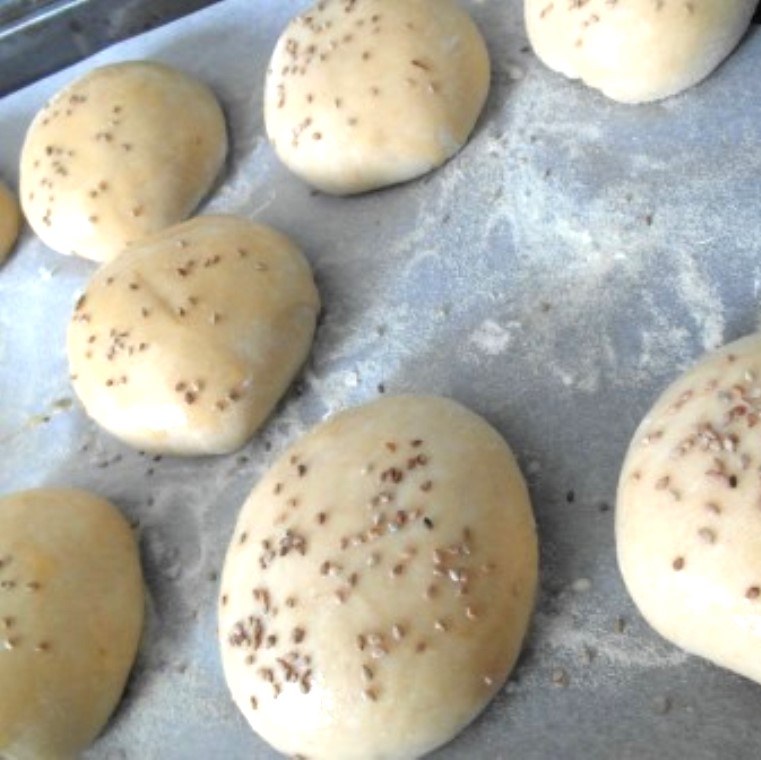 Precalentamos el horno a 200º, cuando esté caliente bajar la temperatura a 180º y metemos los panecillos que habremos pintado con huevo batido y leche. Ponemos por encima semillas de sésamo.