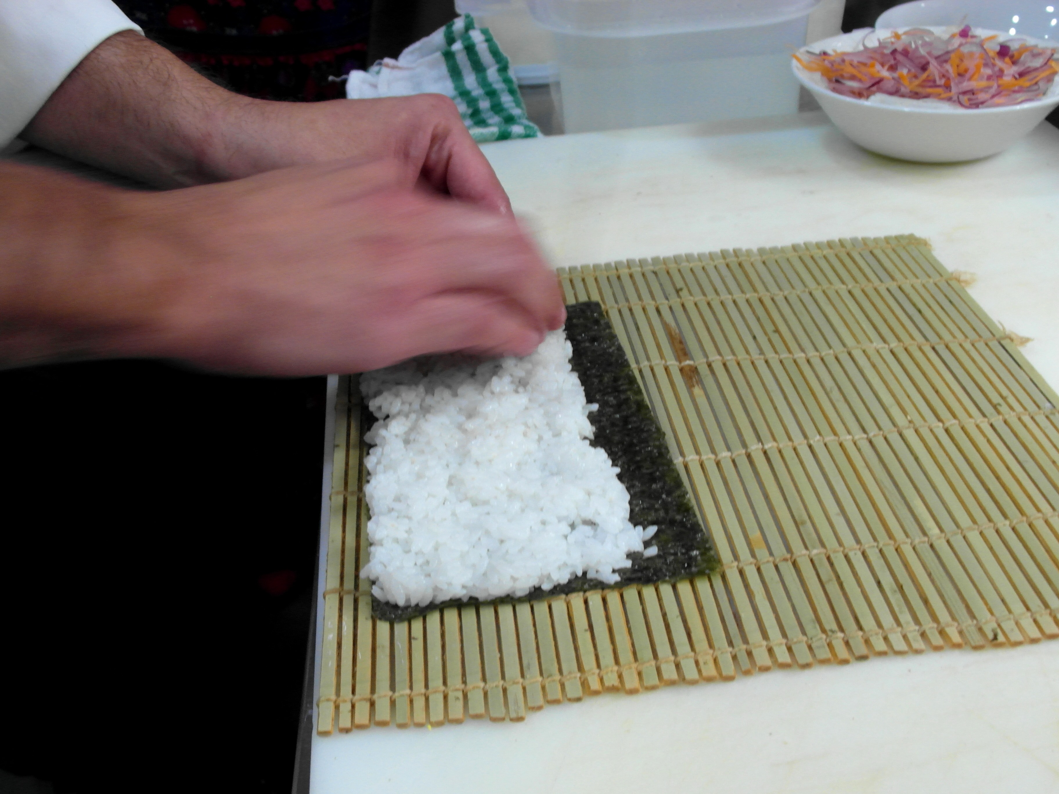 Sobre la lámina de algas se coloca el arroz prensado y en el centro el relleno que elijamos, verdura picadita, atún, queso fresco y aguacate, buey de mar…