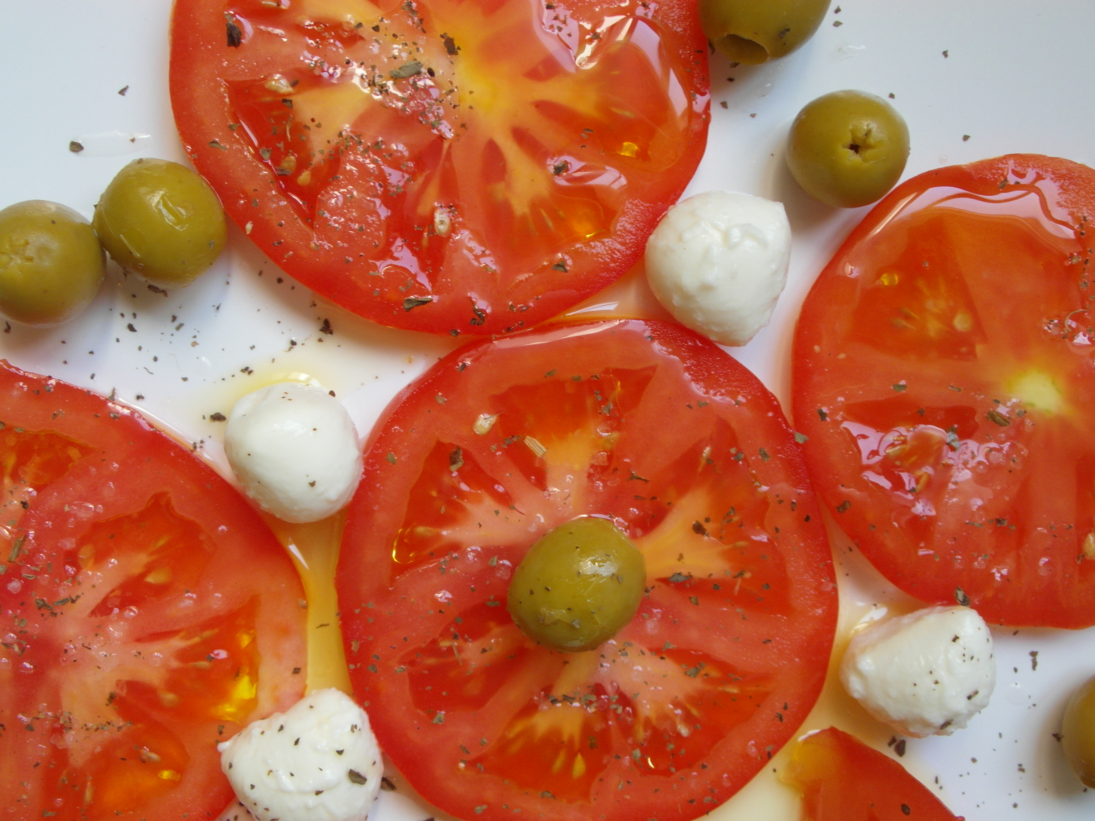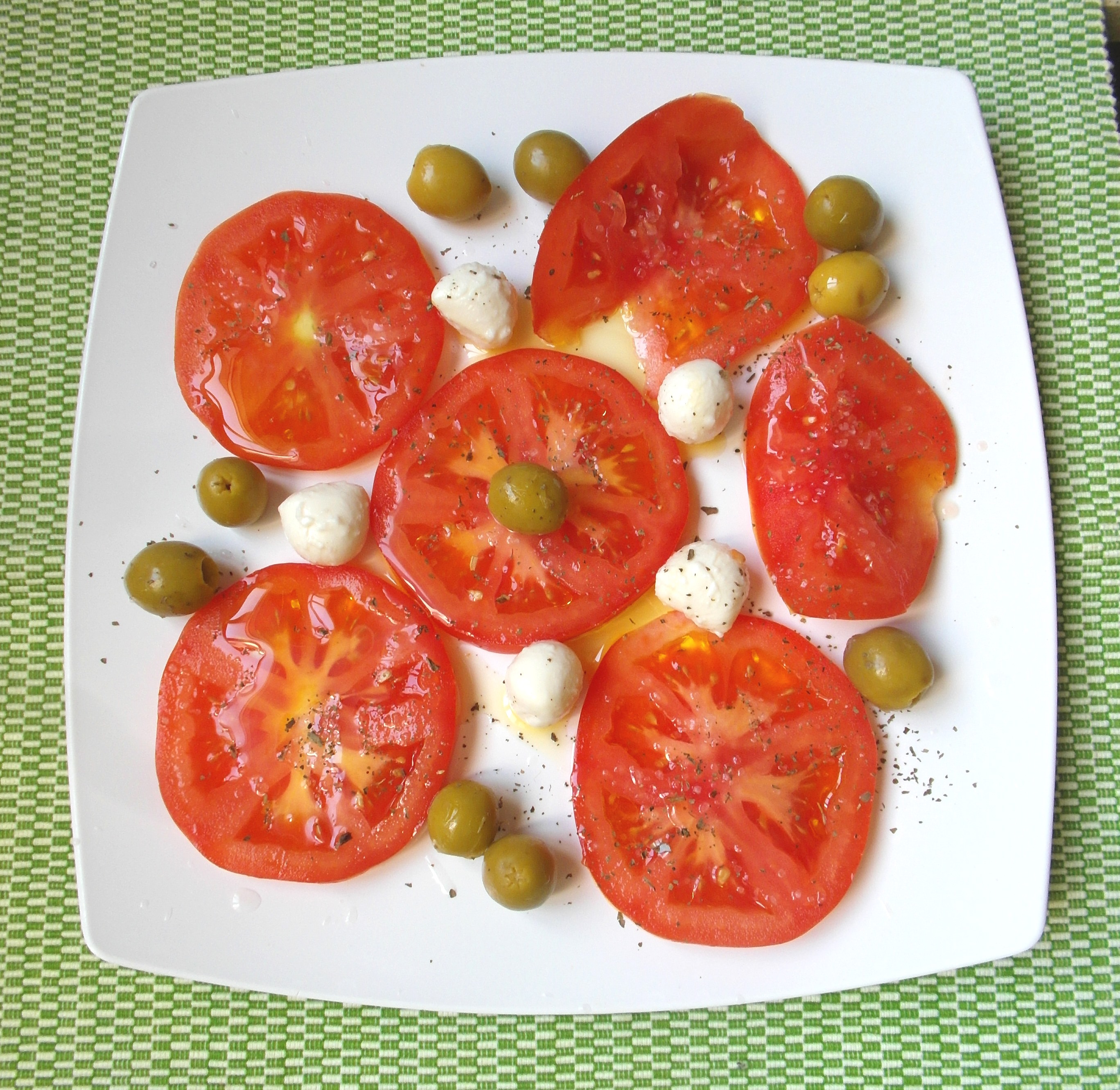Cortamos los tomates en rodajas y los colocamos en una bandeja, añadiendo las aceitunas y los quesitos. Lo aliñamos con sal, vinagre y aceite y echamos por encima un poco de albahaca.
