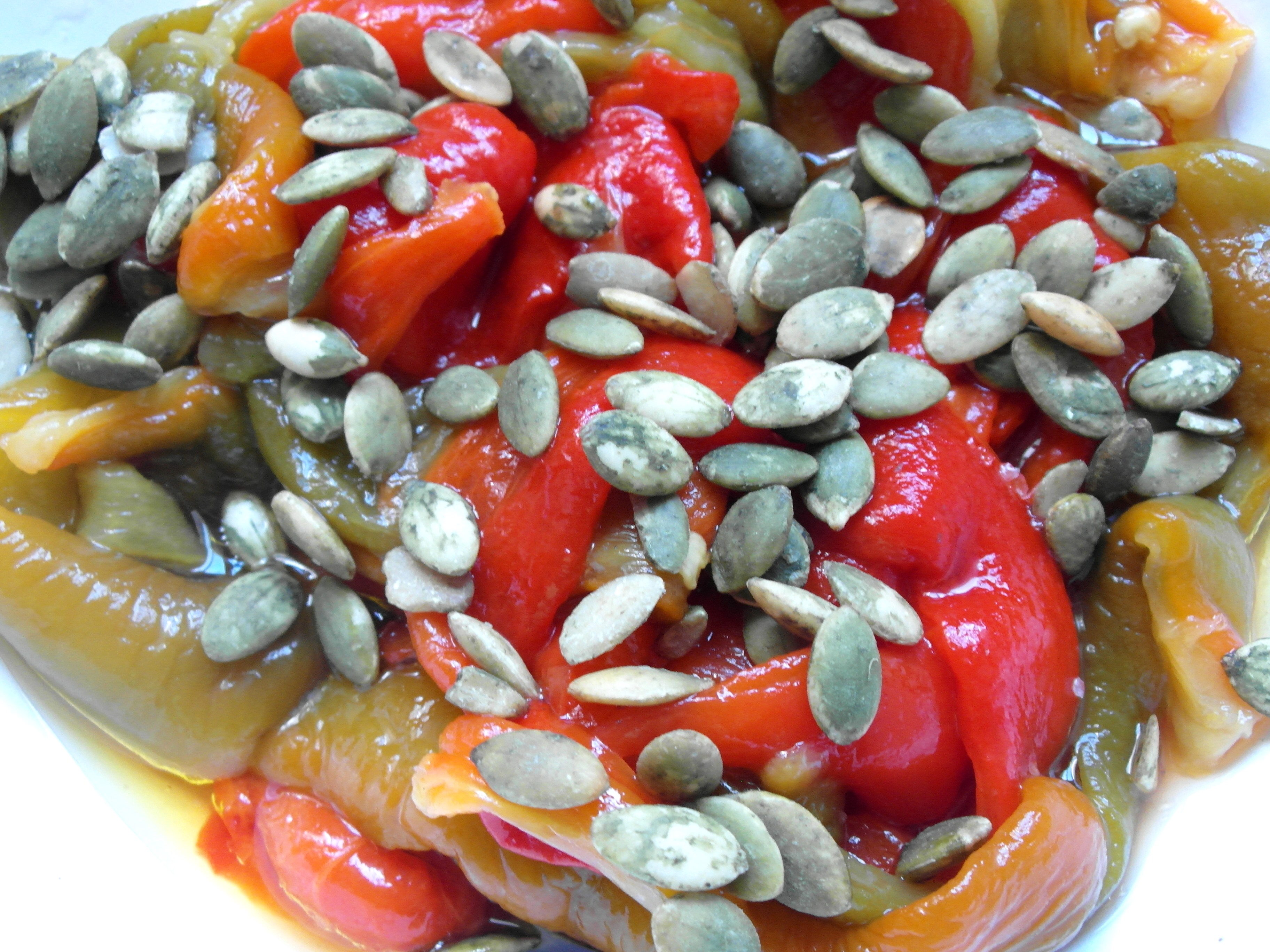 Para hacer la siguiente ensalada pelamos los pimientos y los cortamos en tiras. Los colocamos en un cuenco y añadimos las pipas de calabaza. Aliñamos con los mismos ingredientes de la de tomate, pero sin albahaca.