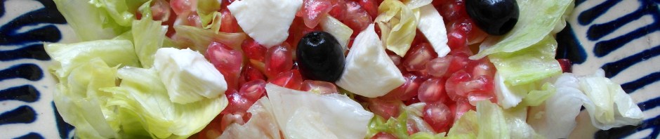 En un cuenco echamos los granos de granada, la lechuga y el queso cortados. Aliñamos con sal, vinagre y aceite de oliva y, por último, añadimos las aceitunas.