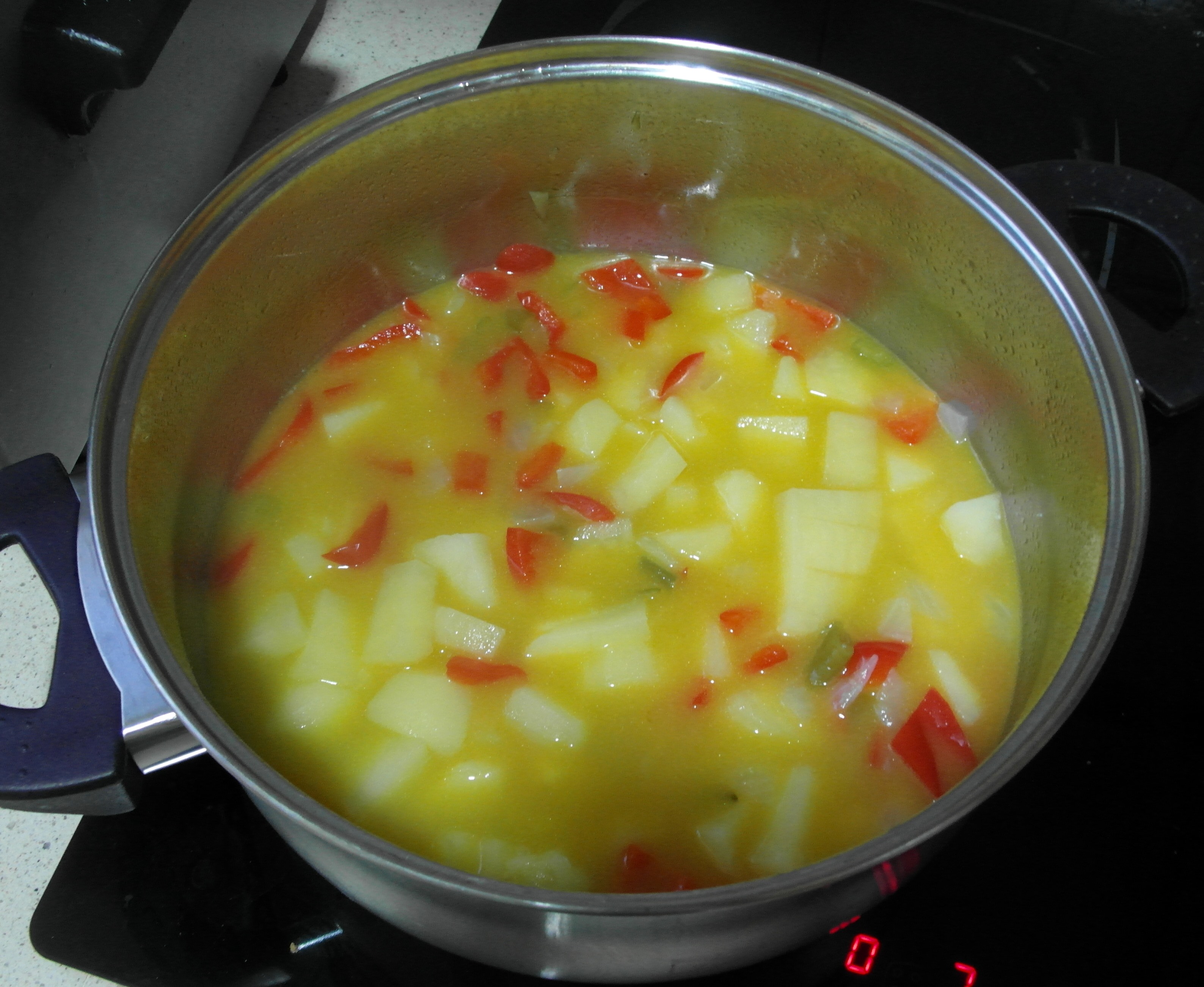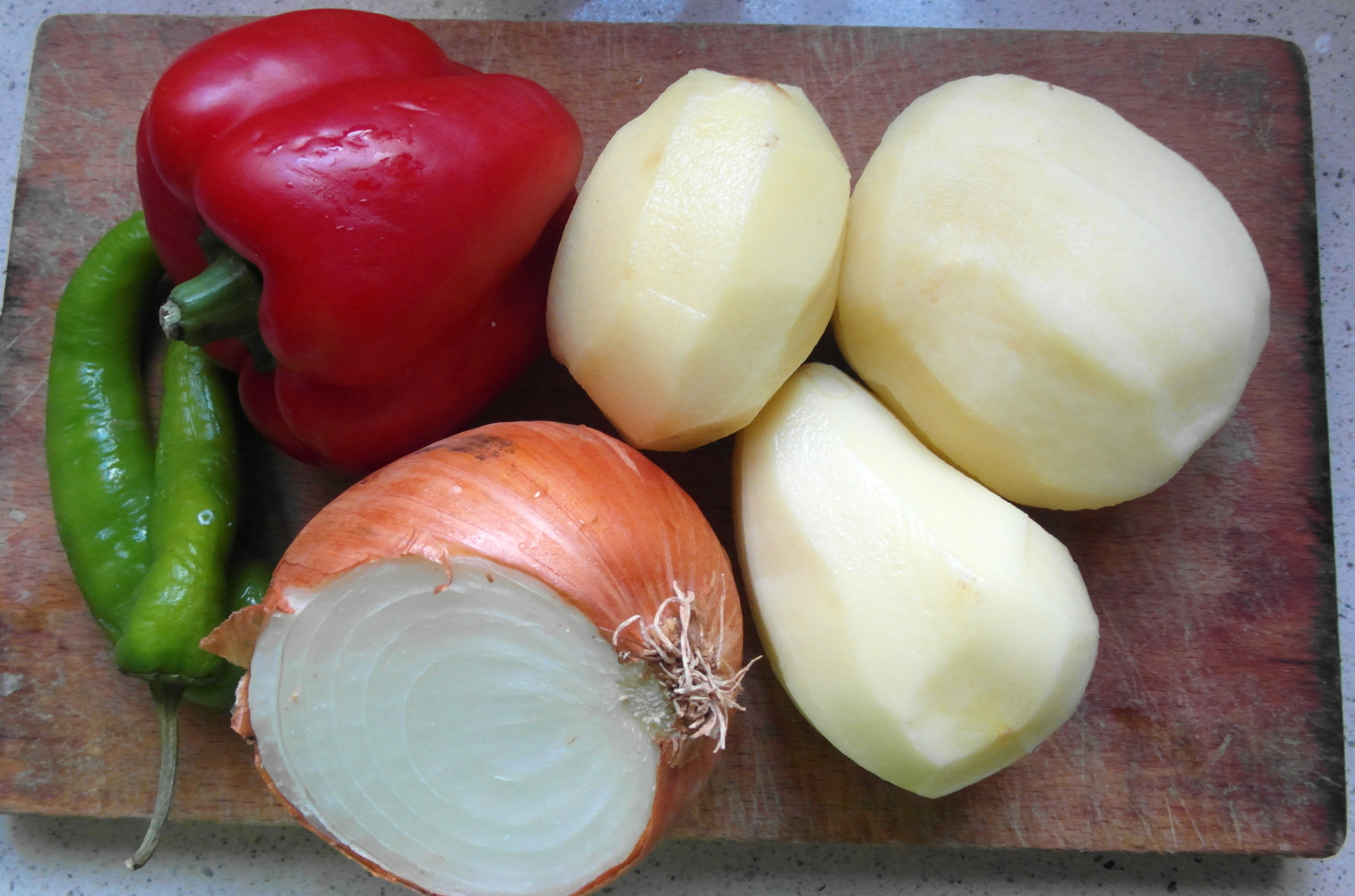 Cortamos en trozos la cebolla y los pimientos. pelamos y cortamos en cuadrados las patatas. En una olla echamos aceite de oliva y sofreímos un poco los tres primeros ingredientes. Añadimos las patatas y sal, y cubrimos con agua.