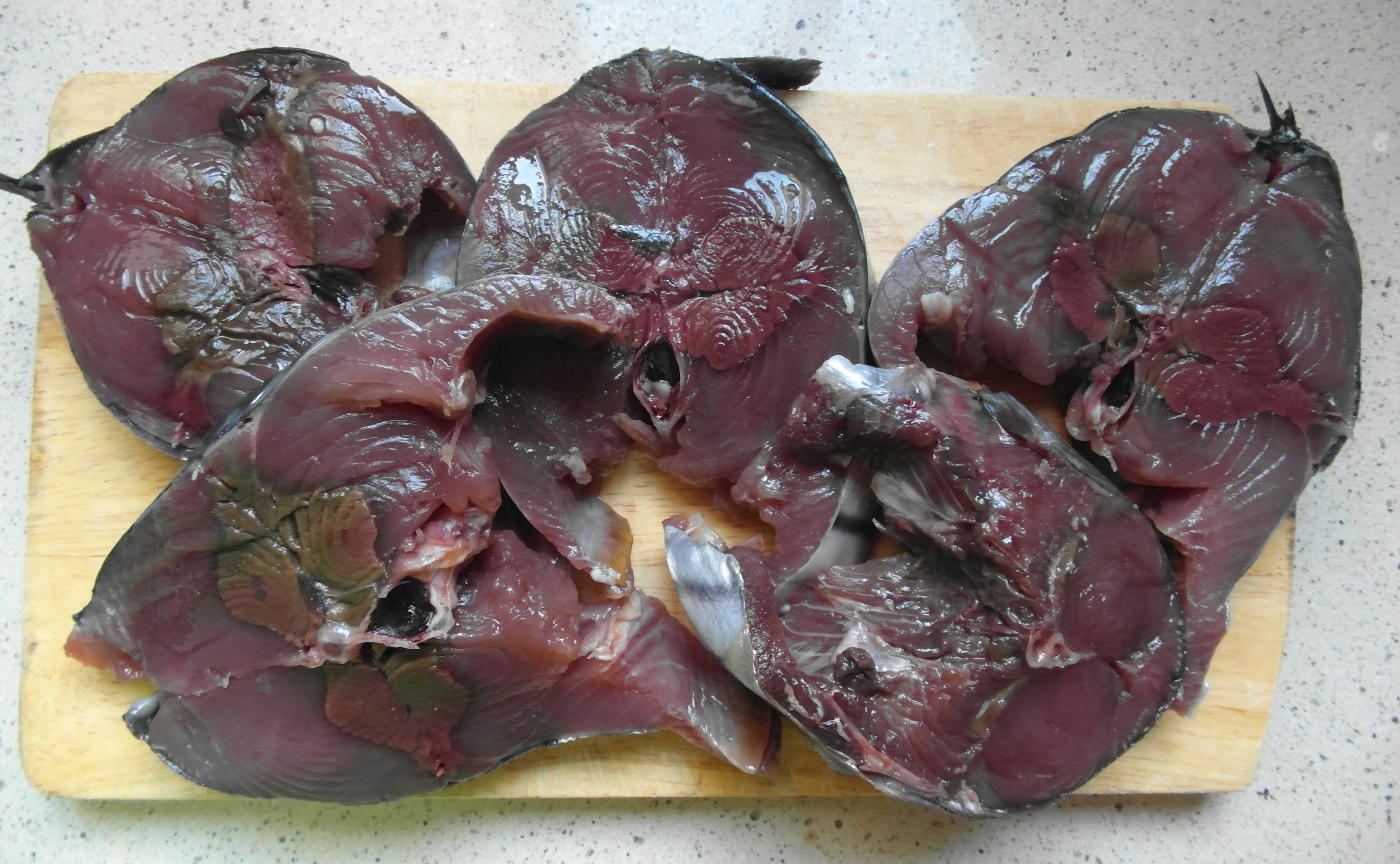 Se limpia la cola y se parte por la mitad, quitando las espinas.