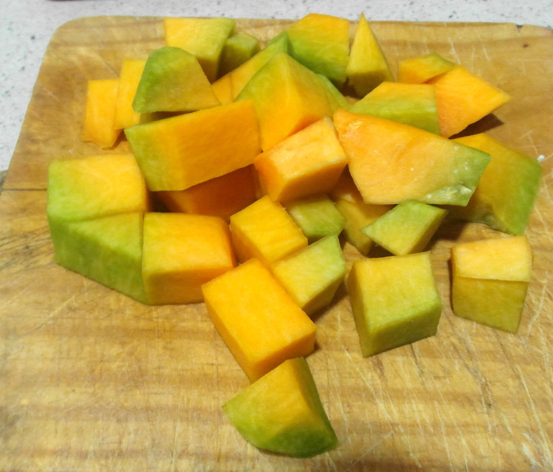 En una olla o cazuela se echa aceite y se dora un poco la cebolla cortada. Añadimos la carne y la pasamos un poco, y a continuación la calabaza cortada en dados.