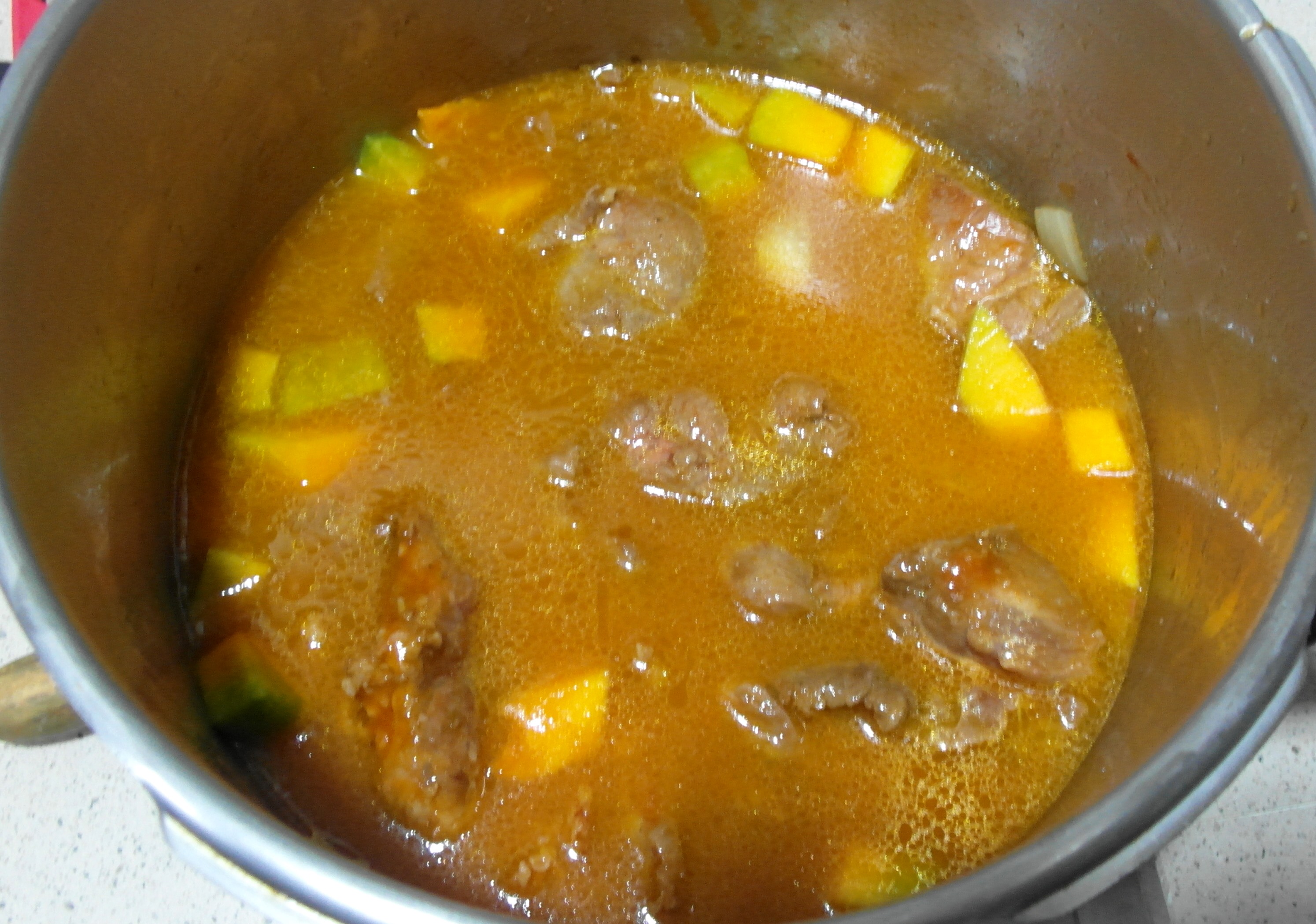 Lo dejamos cocer con caldo hasta que esté tierna la carne y la calabaza.
