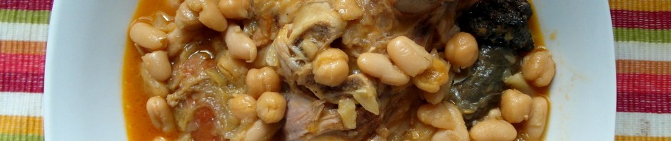 En una olla rápida echamos la col cortada y encima las legumbres. Por último la carne,el chorizo y la morcilla. Añadimos pimentón, sal y comino.