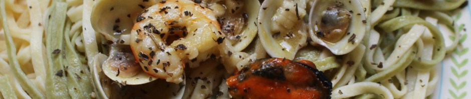 Con frutti di mare que dirían los italianos. En Italia precisamente compré este tipo de pasta, los tagliolini, parecidos a los spaguetis pero planos, y de dos colores, normales y con espinacas. Y para cocinarlos elegí productos de nuestra tierra, gambas, chirlas, mejillones…Riquísimos.