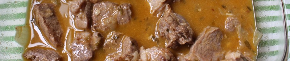 Echamos pan rallado y pimentón, a continuación la carne, el vino y sal a gusto. Cubrimos de agua y la ponemos al fuego hasta que esté tierna la carne y la salsa trabada.