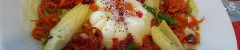 El cocinero es Angel Benítez, quien se formó en la escuela de Hostelería de Rota, acabando sus estudios en la de Arcos de la Frontera. Un gran cocinero que ha elaborado platos estupendos y algunos de ellos han obtenido premio, como este con Huevo campero a baja temperatura con espaguetis de vegetales y crema de patatas y jamón ibérico…exquisito.