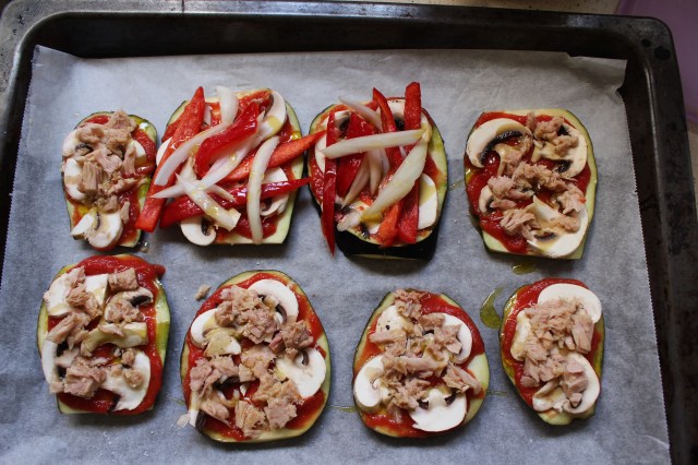 En unas rodajas podemos pones  pimiento y cebolla, con atún.