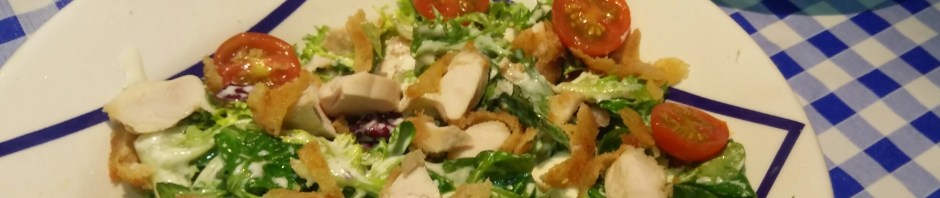 Esta ensalada César es particular, «de casa», con restos de pollo empanado que me habían sobrado, y la verdad es que el pollo empanado está riquísimo de un día para otro. No tiene todos los ingredientes que debería llevar la ensalada César, faltan los picatostes, por ejemplo…pero el empanado los suple.