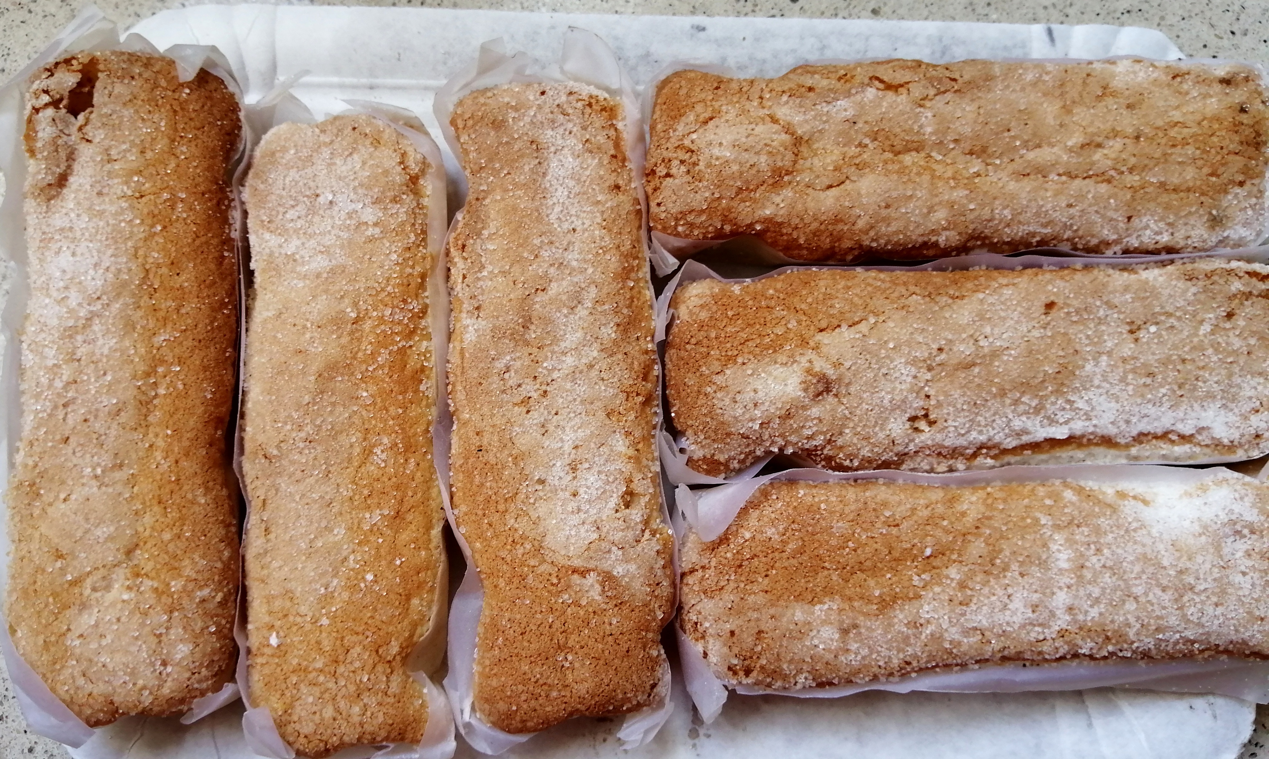 Ponemos los bizcochos en una bandeja y los emborrachamos con el vino. En otra bandeja cuadrada o rectangular, que tenga las paredes altas, vamos poniendo bizcochos hasta cubrir el fondo.
