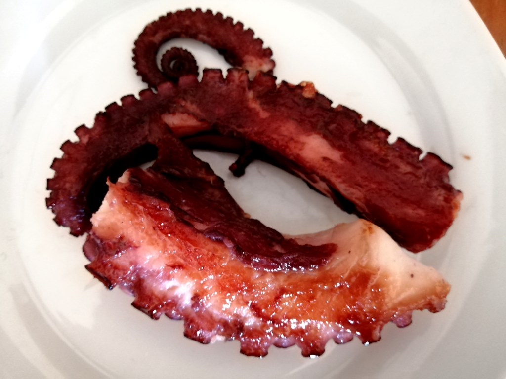 La pata de pulpo es mejor comprada ya cocida. La pasamos por unas gotas de aceite en una sartén y echamos sal por encima.