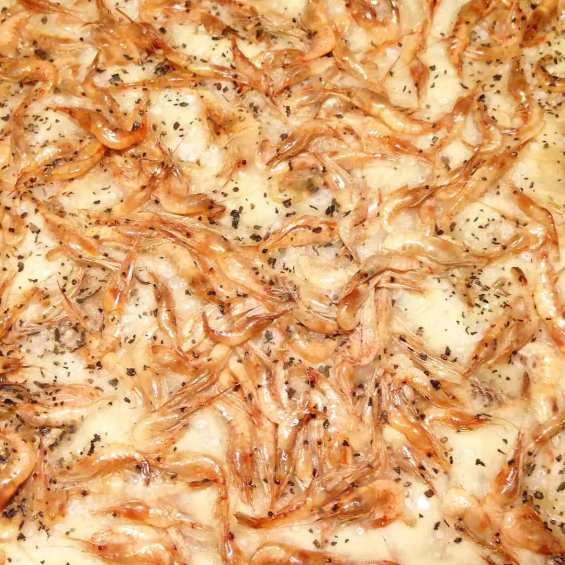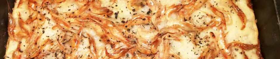 Para hacer la focaccia y saber sobre ella os remito a cualquiera de mis recetas anteriores de este producto italiano. Como podeis ver, hay cuatro recetas distintas, se puede acompañar de diversos ingredientes, en este caso hemos usado camarones de los esteros de las salinas de Puerto Real. Por su naturaleza son muy sabrosos y dan mucho sabor a todo lo que se haga con ellos, y esta focaccia estaba riquísima.