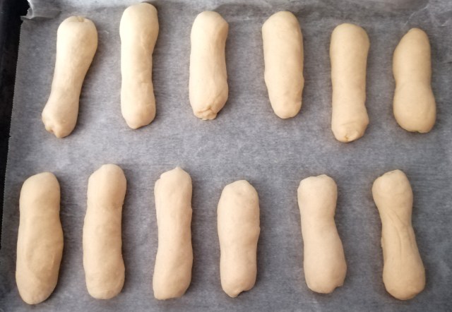 Dejamos que repose una media hora en un recipiente cóncavo y tapado. Con esta masa hacemos porciones de unos 40 gramos y los colocamos en una bandeja de horno, reposando hasta que se doble su tamaño.