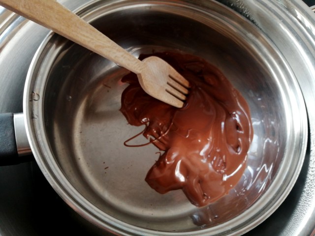 Derretimos el chocolate al baño María y pintamos con él los bollitos.